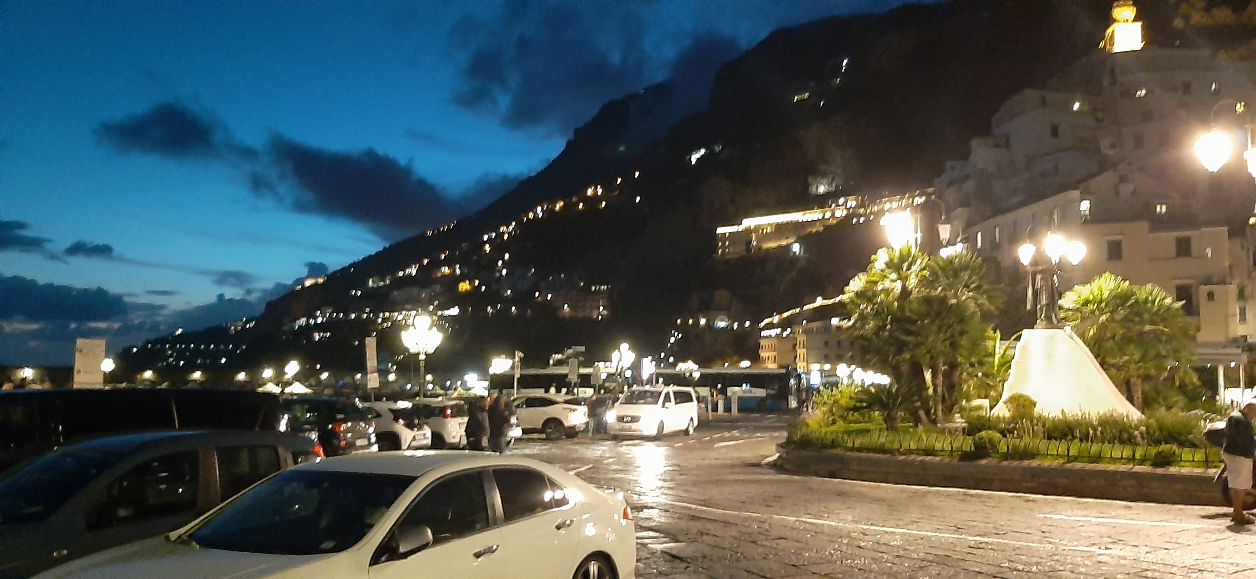 아말피 해변으로 방향을 잡고, 꾸불꾸불한 해안길을 한참 운전하고 가는데 괜히 왔다는 생각이 든다. 하지만 사나이가 질렀으니 돌아갈 수는 없다. 작은 차를 빌린 것이 천만다행이지만, 수동기어라 2단에서 3단으로 계속 기어변속을 하는 것도 힘들고 불편하여, 아예 2단 오토로 계속 달린다. 70킬로의 속도에서도 2단으로 주행하니, 작은 차의 알피엠이 3천을 넘나 든다. 우리의 안전이 차보다 소중하므로 계속 2단으로 달린다. 차가 작아서 연비는 아주 좋다. 피렌체에서 렌트한 지프 컴퍼스 4륜구동의 연비와는 천지차이이다. 좁은 도로에서 마주치는 차들을 피하면서 운전하는 것이 힘들어서 경치는 볼 수조차 없다. 가끔 내려서 경치를 보고 인증 숏을 한다. 사방이 컴컴한 6시쯤에 아말피 해변에 도착했다. 잠시 구경을 하고 근처의 분수에서 인증 숏도 찍고, 좀 쉬면서 숙소로 돌아가는 루트를 검색한다.