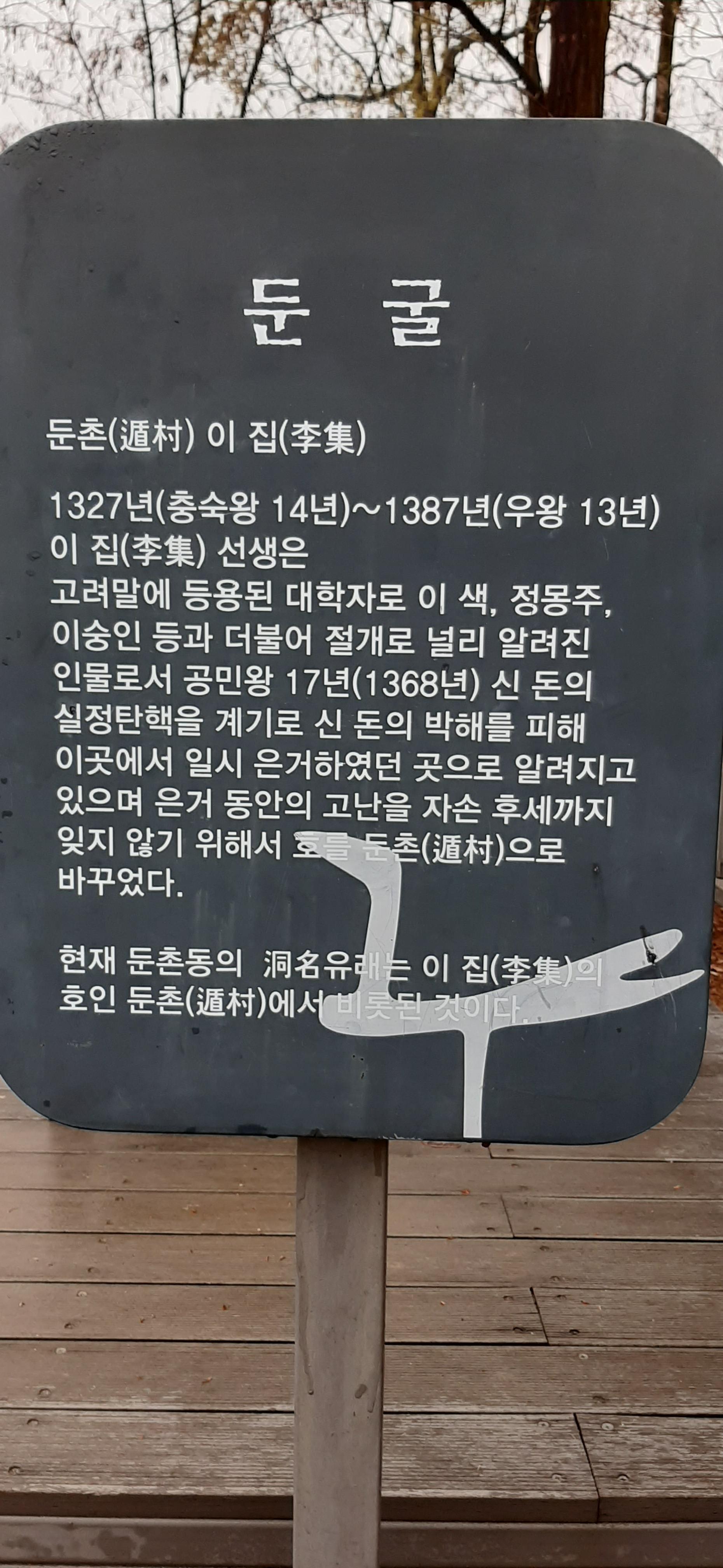 고려말 충목왕, 공민왕 시절 충신인 이집 선생님께서 신돈의 박해를 피하여 일자산에서 은거하던 곳(둔굴)으로 알려졌으며, 은거하는 동안의 고난을 자손 후세까지 잊지 않기 위하여 호를 둔촌으로 바꾸었다고 한다. 이집 선생님께서는 일자산에 있는 동굴에서 기거를 하셨고, 둔촌동의 지명은 이집 선생님의 호를 둔촌을 본떠서 만들었다고 한다.