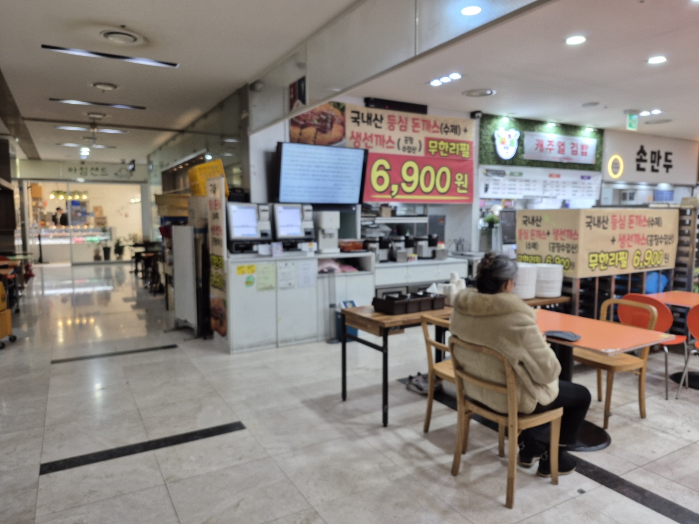 푸드코트로 가니 돈가스 무한리필 6,900원이라고 쓴 플래카드가 보인다.
