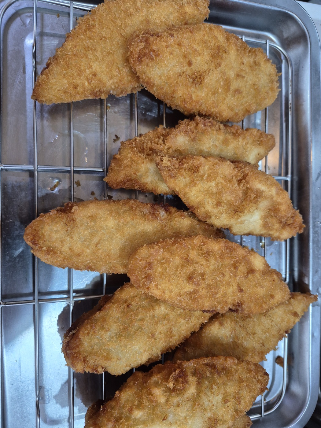 젊은 주인은 주방에서 돈가스와 생선가스를 튀겨서 그릇에 담아 놓는다.