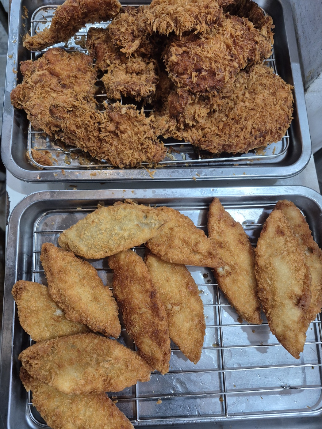 젊은 주인은 주방에서 돈가스와 생선가스를 튀겨서 그릇에 담아 놓는다.