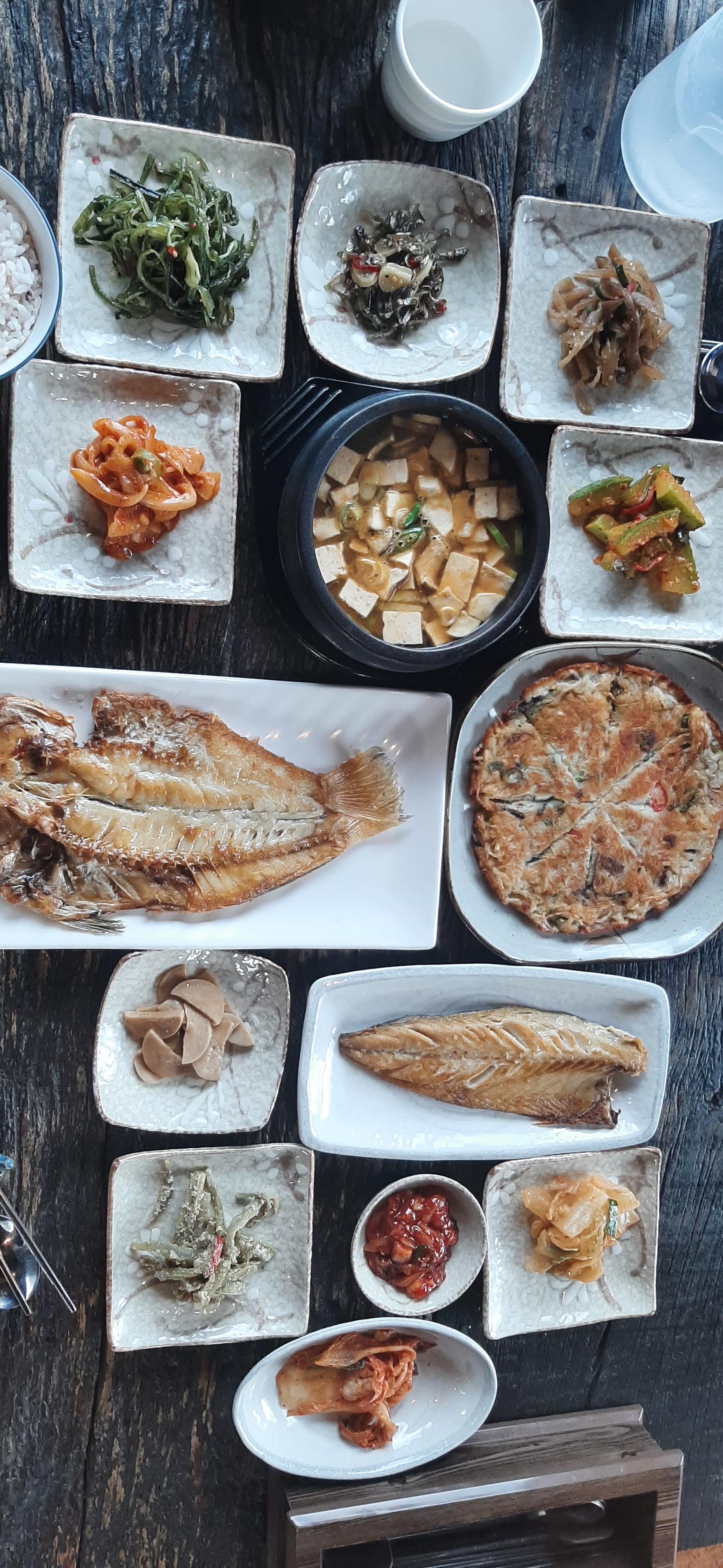편운정식은 제주의 특산물인 옥돔구이, 녹두빈대떡, 된장찌개가 기본으로 나오고, 추가되는 인원에 따라서 고등어구이가 추가된다. 함께 나오는 반찬도 정갈하고 맛있다. 내가 광주에서 어머니와 함께 간 곤지암 도척에 있는 어선비와 음식이 비슷하다.