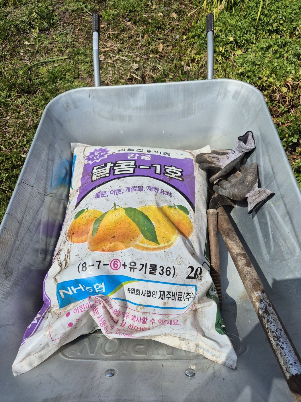 2025년 3월 26일(수요일) 오후에 비가 온다고 하여 귤나무에 비료를 준다. 비료 1포대는 20킬로그램이다.
