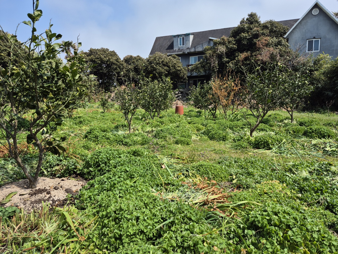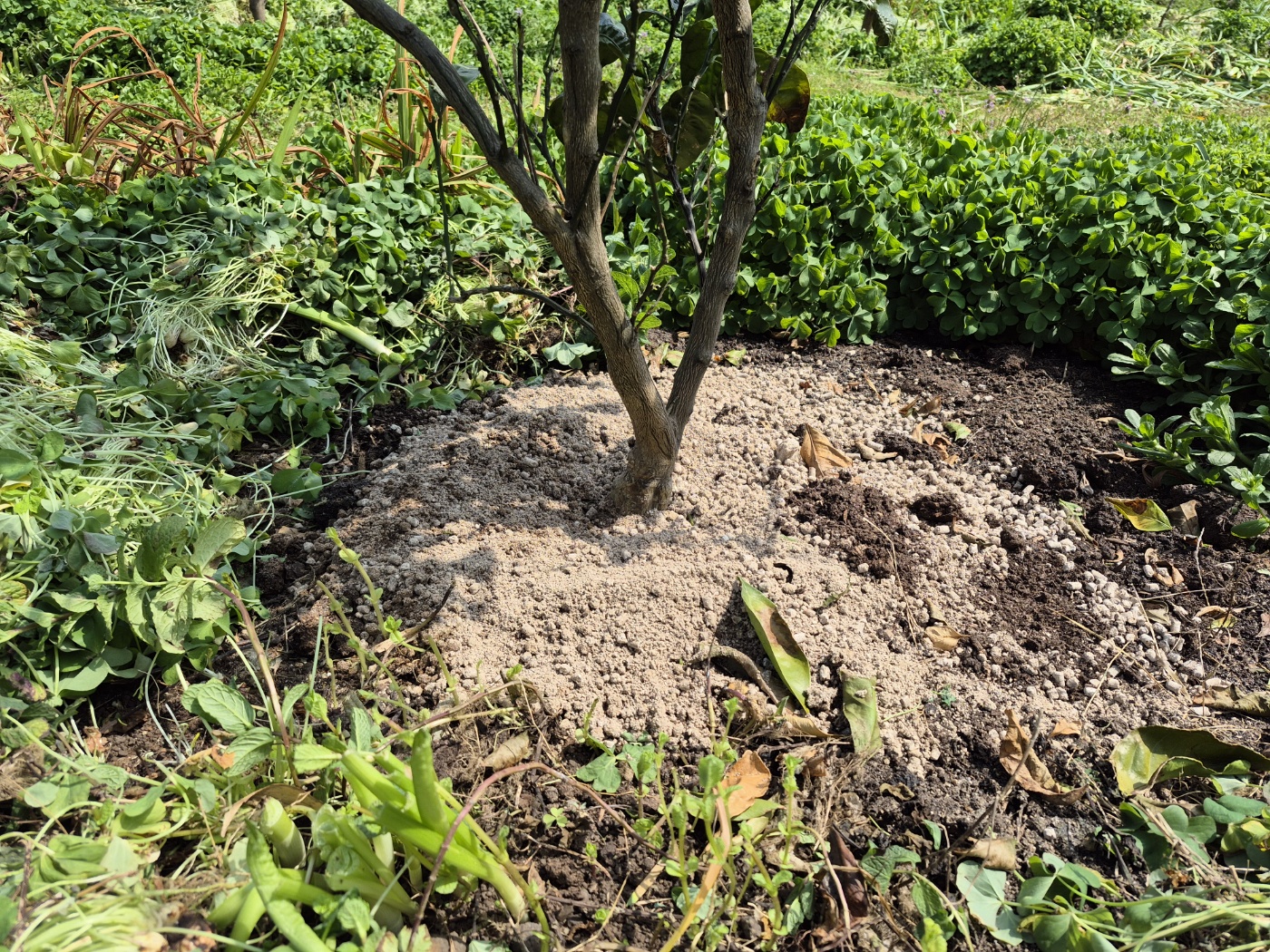 귤나무 주위에 난 잡초를 제거하고, 삽으로 달콤 1호를 귤나무 아래에 뿌리고, 손으로 잘 다듬어 주면 된다.