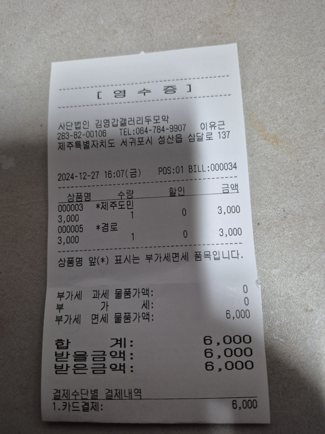 김영갑갤러리 두모악 입장권 가격은 일반인 5,000원이지만, 나는 대한민국에서 인정하는 어르신, 마님은 제주도민이라 각 3,000원씩 6,000원을 키오스크를 사용하여 결재하고, 입장권을 제출하고 입장을 하면서, 관리하시는 분에게 사진을 찍어도 되는지 물어보니, 찍어도 된다고 하여 편한 마음으로 필요한 사진을 찍는다.