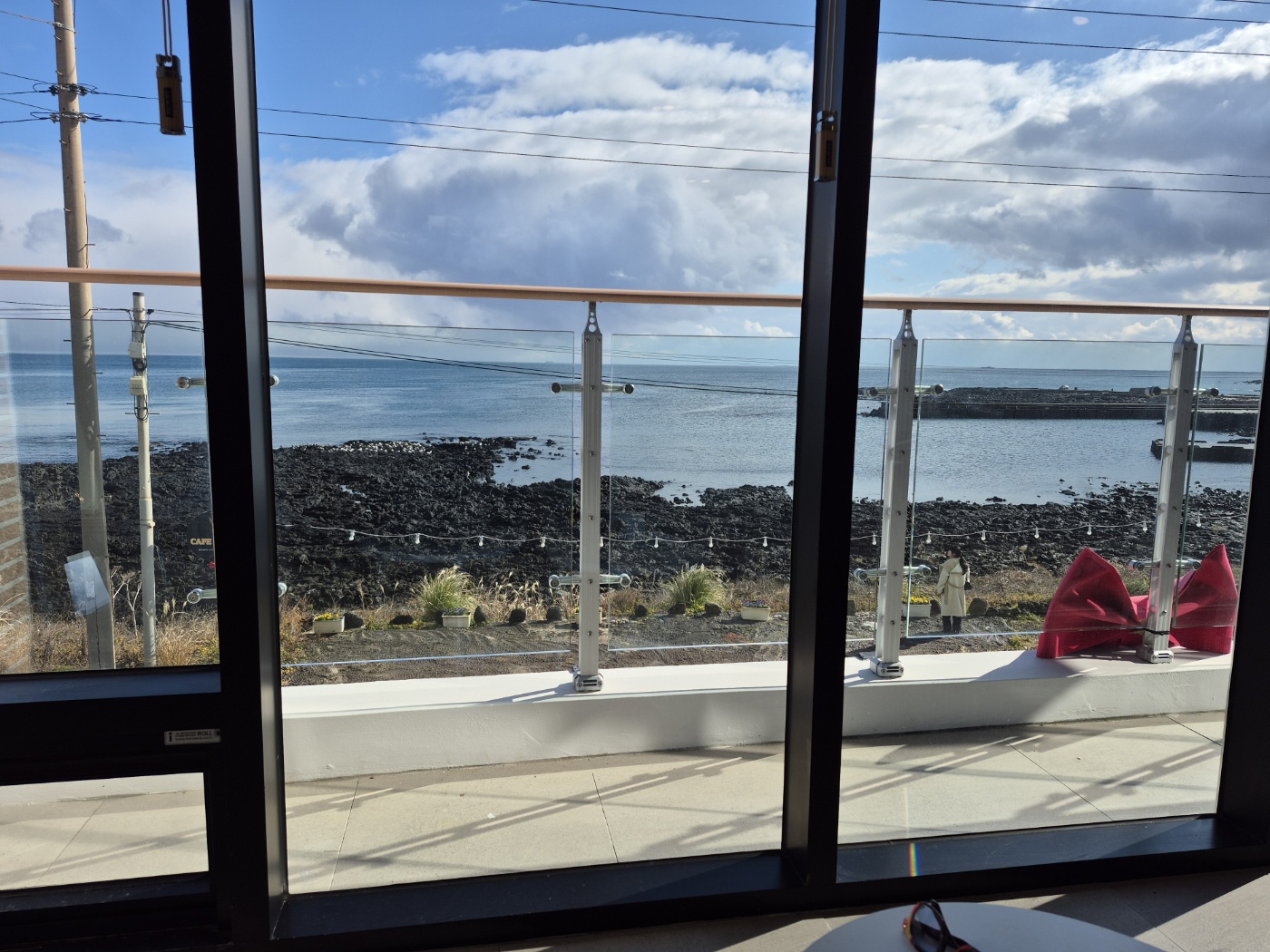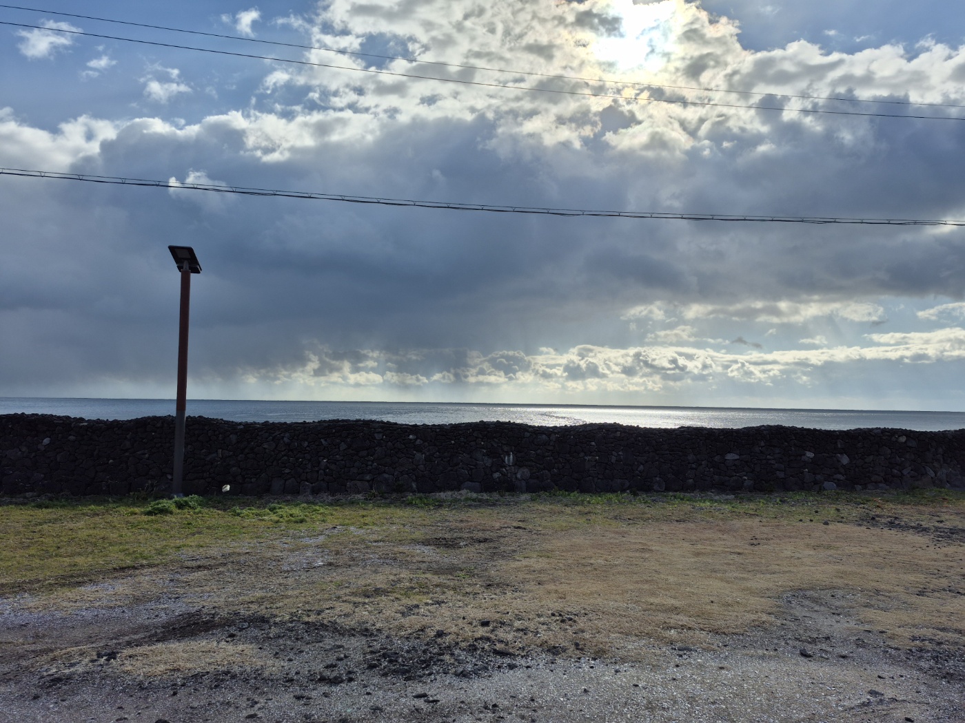 카페 보리 앞 해안도로는 올레 3-1길이다. 올레길을 걷는 사람들이 가끔 지나간다. 아주 센 바람이 육지에서 바다로 부니, 해안가에 바닷물이 바다로 점점 멀어져 간다. 파도가 치는 것과는 정 반대의 현상이다. 날씨는 시시각각으로 변하여, 변화무쌍하다는 표현이 어울린다.