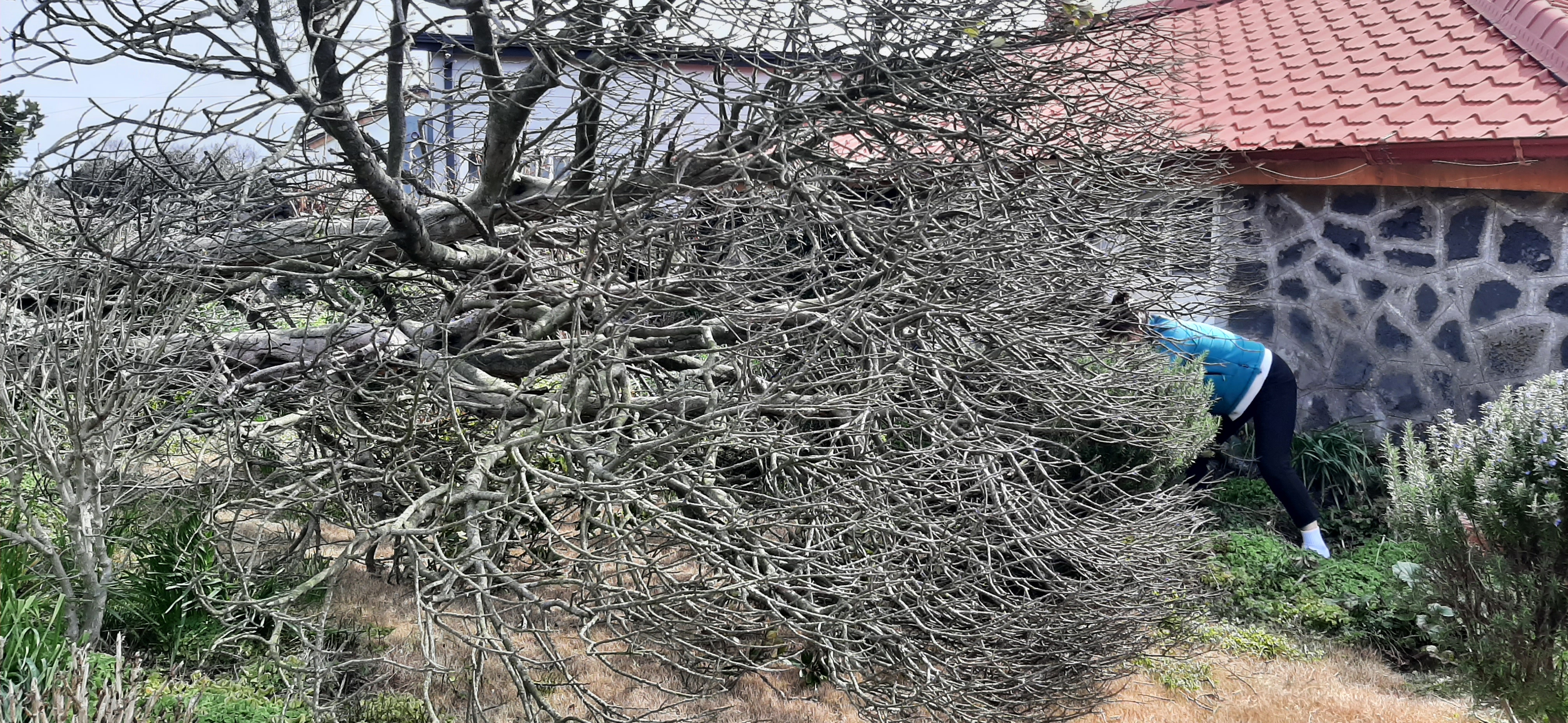 서귀포 나들이를 하려고 준비하는데 갑자기 큰 소리가 들려서, 나가보니 집 뒤에 큰 고목이 쓰러졌다. 다행히 집은 무너진 곳이 없다. 천만다행이다. 나무가 조금만 더 컸어도 집을 덮쳐서 아주 큰 사고가 났을 텐데 정말 다행이다.