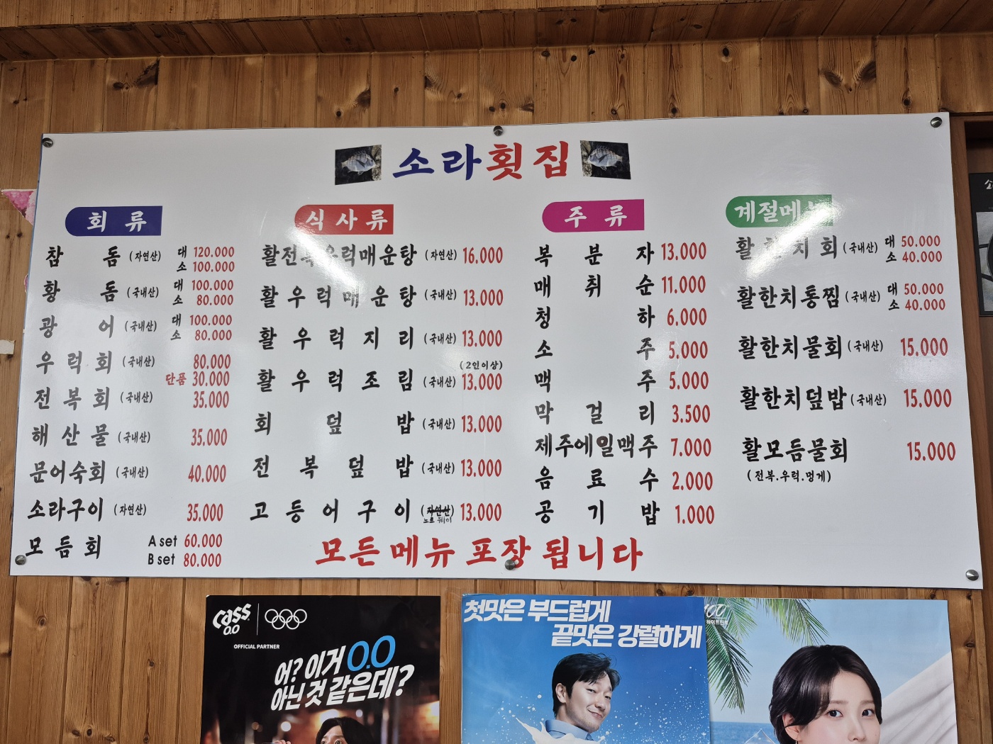소라횟집은 구좌읍 평대리 해안도로에 있어서 바다를 보면서 식사를 할 수 있고, 우럭매운탕이 맛있다.