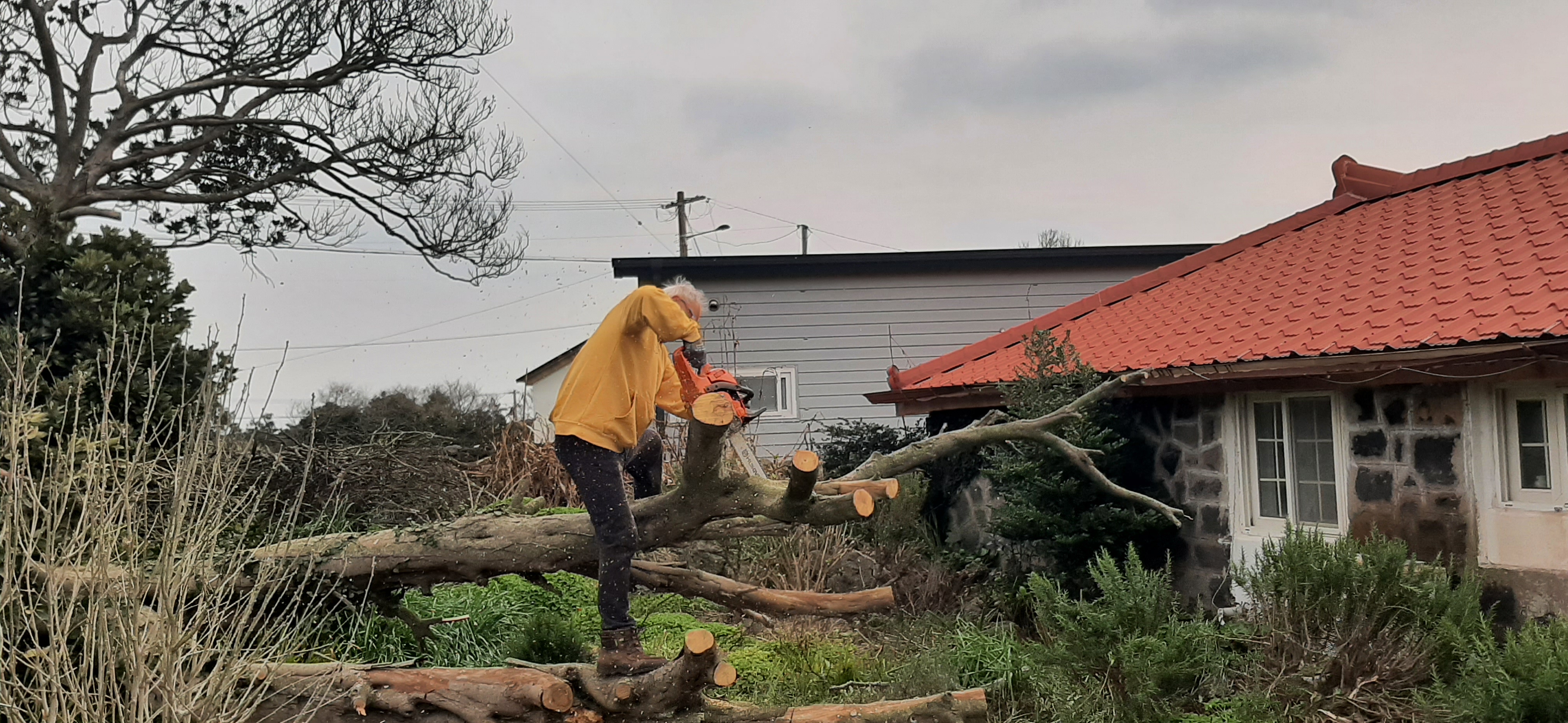 자른 나무들을 돌담에 쌓아놓고, 혹시 모를 피해에 대비하기 위하여 큰 나무들의 가지도 자르고 정리를 한다.