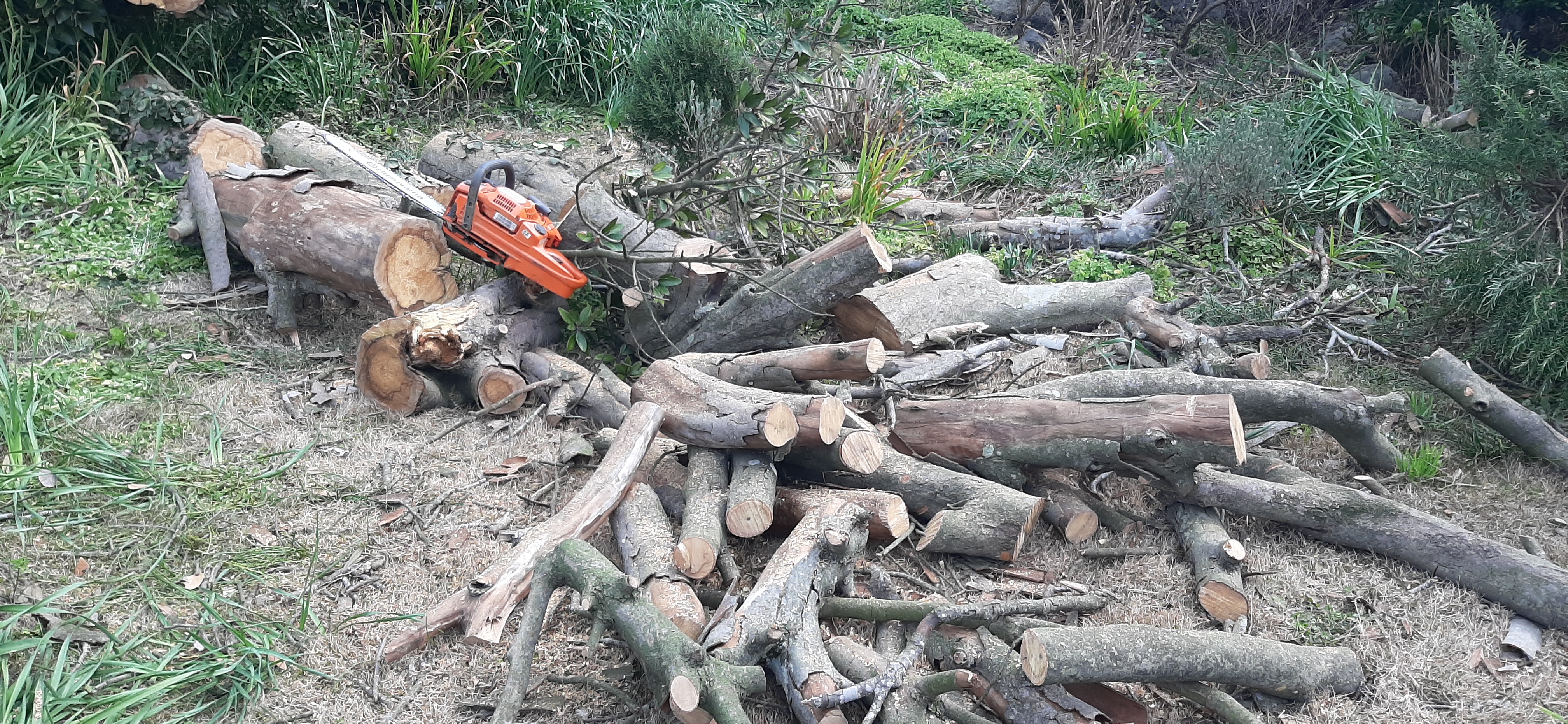 자른 나무들을 돌담에 쌓아놓고, 혹시 모를 피해에 대비하기 위하여 큰 나무들의 가지도 자르고 정리를 한다.