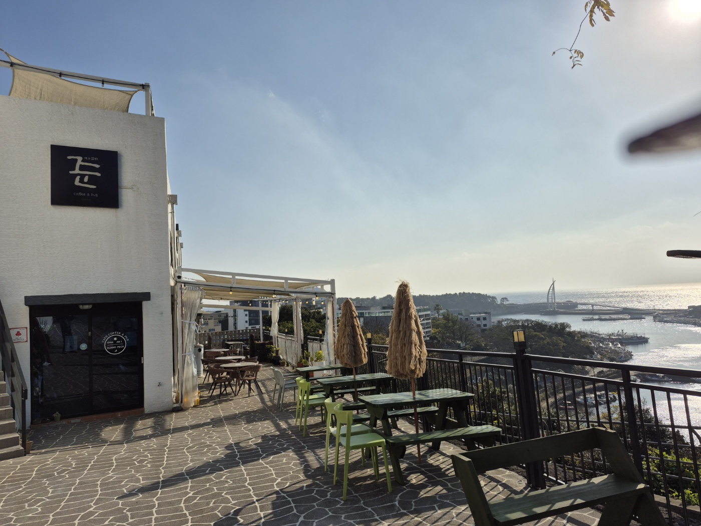카페준은 경치가 좋아서 우리가 자주 가던 카페이다. 카페준에 마련된 야외 테이블에 앉아서 따듯한 햇빛을 쬐면서 친구와 아까 눈치 보면서 하던 핫한 주제로 대화를 한다.