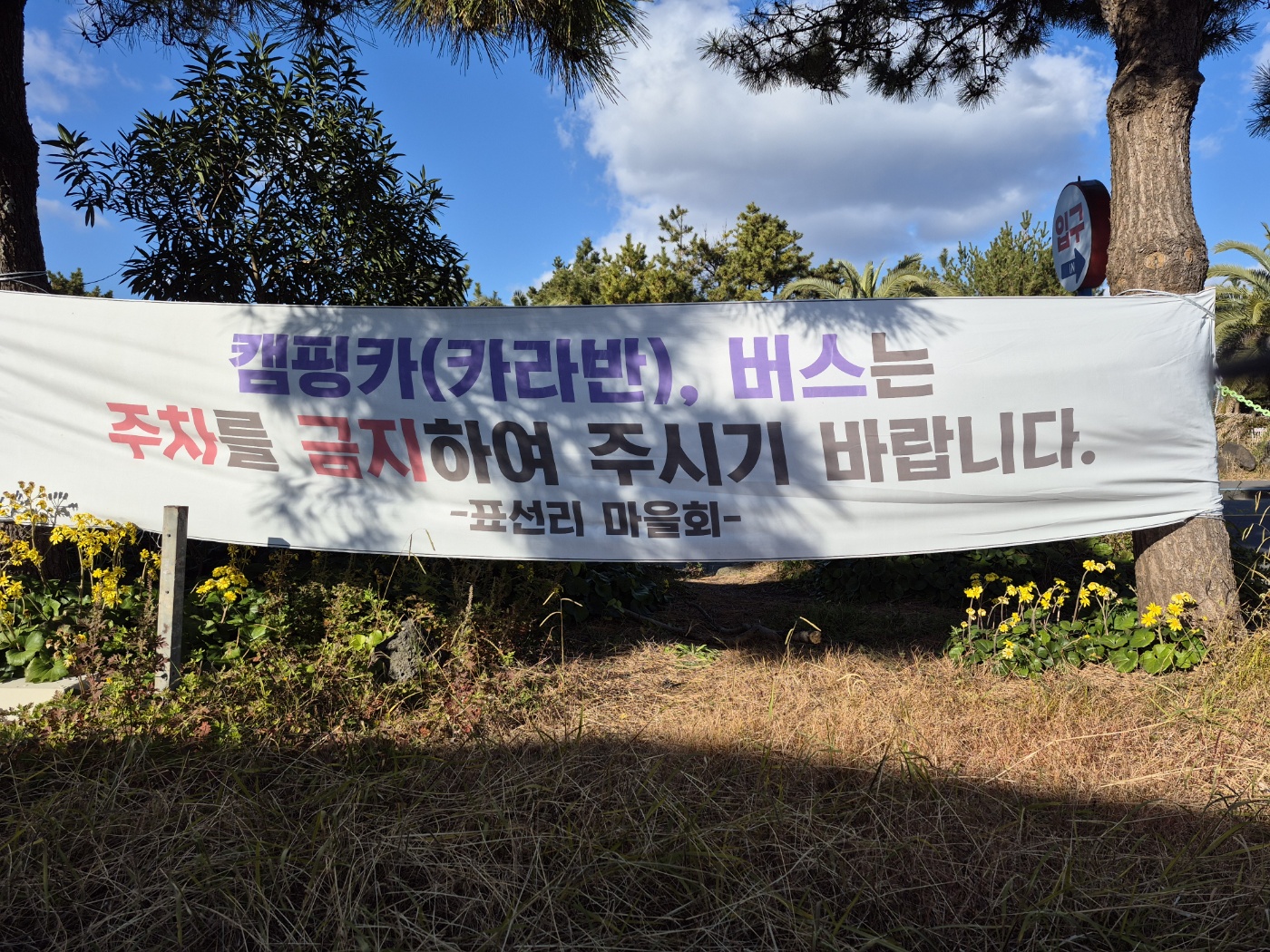 주차장에는 캠핑카, 카라반, 버스는 주차를 금지한다는 플래카드가 걸려있다.