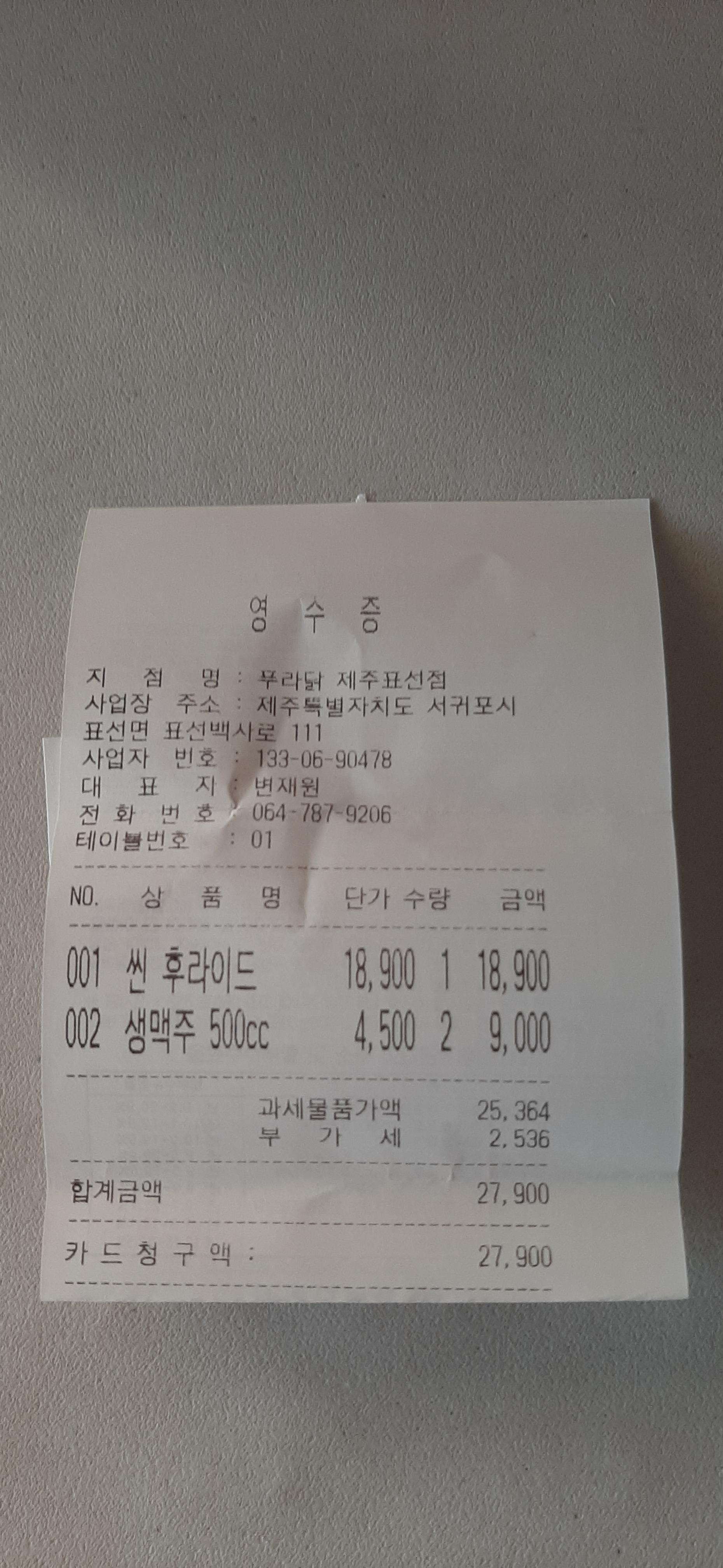 푸라닭치킨 표선점의 기억은 아주 좋고, 다음에 제주도에 가면 또 가서 치킨과 생맥주를 먹을 생각이다. 배가 불러서 남은 치킨을 포장해서 집으로 간다.