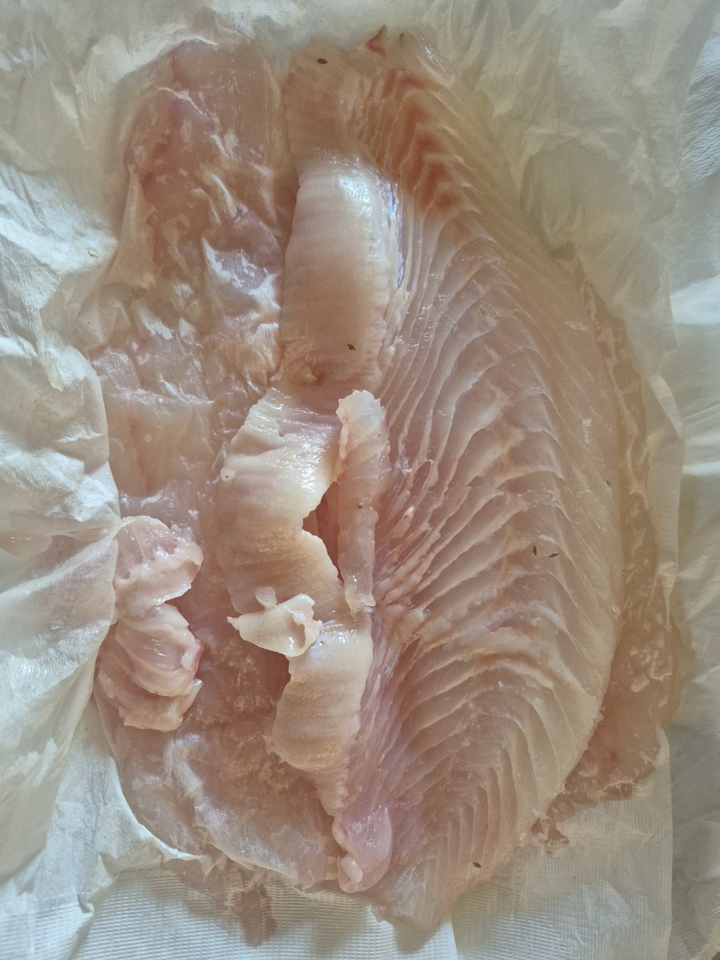 광어의 한면을 둘로 분리해야 하는데, 가운데에 뼈가 있어서 중앙에서 1센티 정도 떨어진