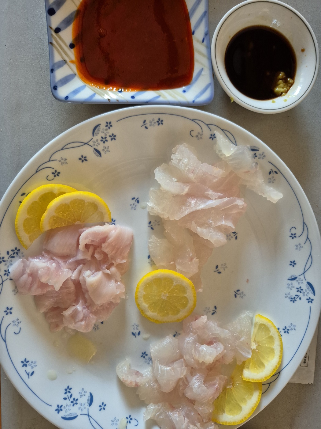 광어는 잡아서 피를 빼고, 죽은 상태로 집으로 가져와서, 도마, 칼, 면장갑, 쟁반, 접시 등