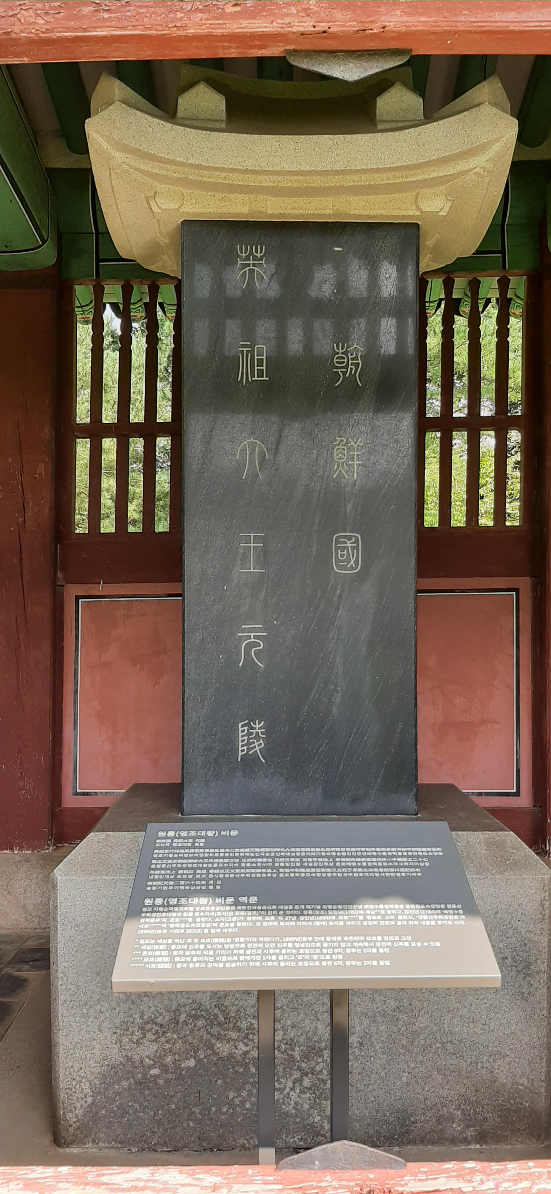 원래 영조는 생전에 첫 번째 왕비 정성왕후의 무덤인 홍릉을 조성하면서 그 곁에 묻히고자 자리를 마련해 두었으나, 영조의 뒤를 이은 정조는 현재의 자리에 영조의 능을 조성하고, 원릉이라 하였다.