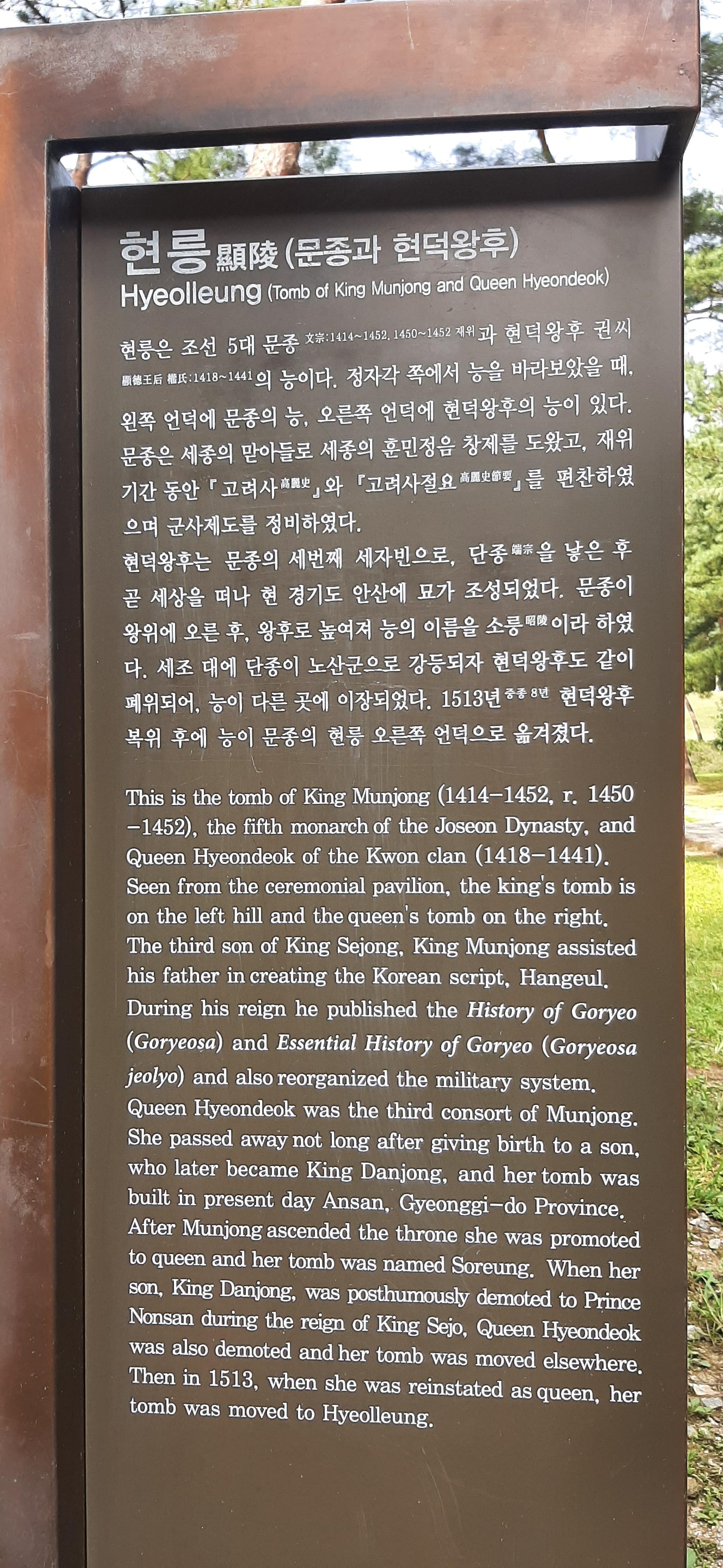 문종(1414 ~ 1452, 재위 1450 ~ 1452)은 세종과 소현왕후의 아들로 8세에 왕세자로 책봉된 후 아버지 세종을 도와 정치실무를 익혔다. 재위기간 동안 "고려사", "고려사절요" 등의 역사서를 편찬하였고, 군사제도를 정비하였다.