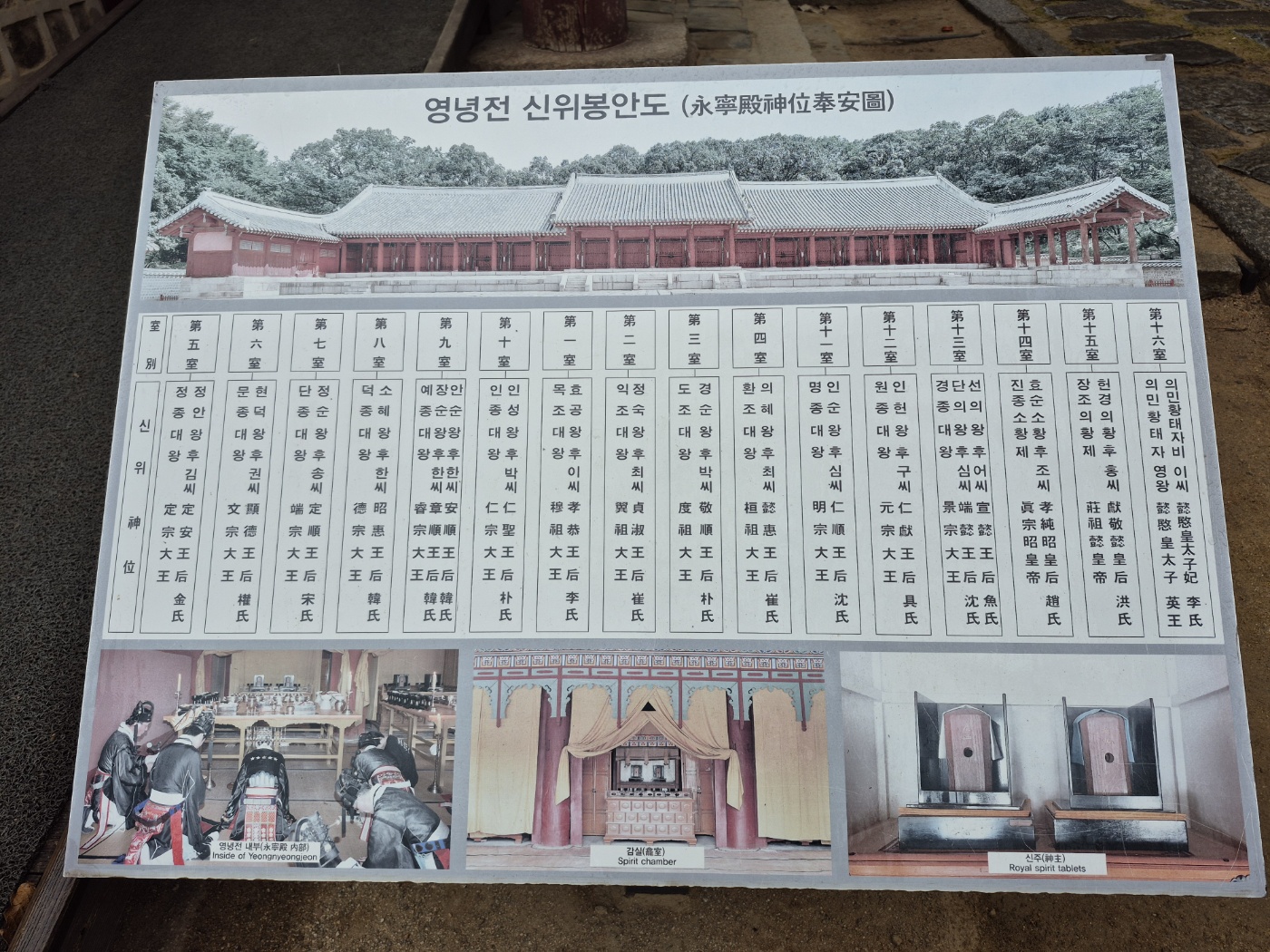 영녕전에는 정전에서 옮겨온 왕과 황제 15위와 왕비와 황후 17위, 그리고 마지막 황태자와 황태자비의 신주가 모셔져 있다.