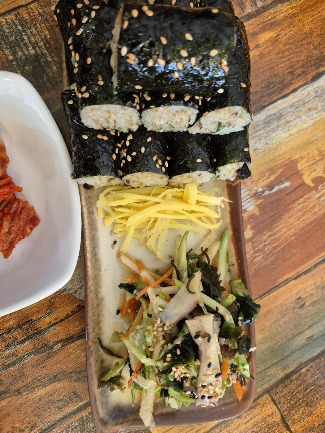 주어코지 국수창고에서 잔치국수와 특제 보말김밥을 먹는다.
