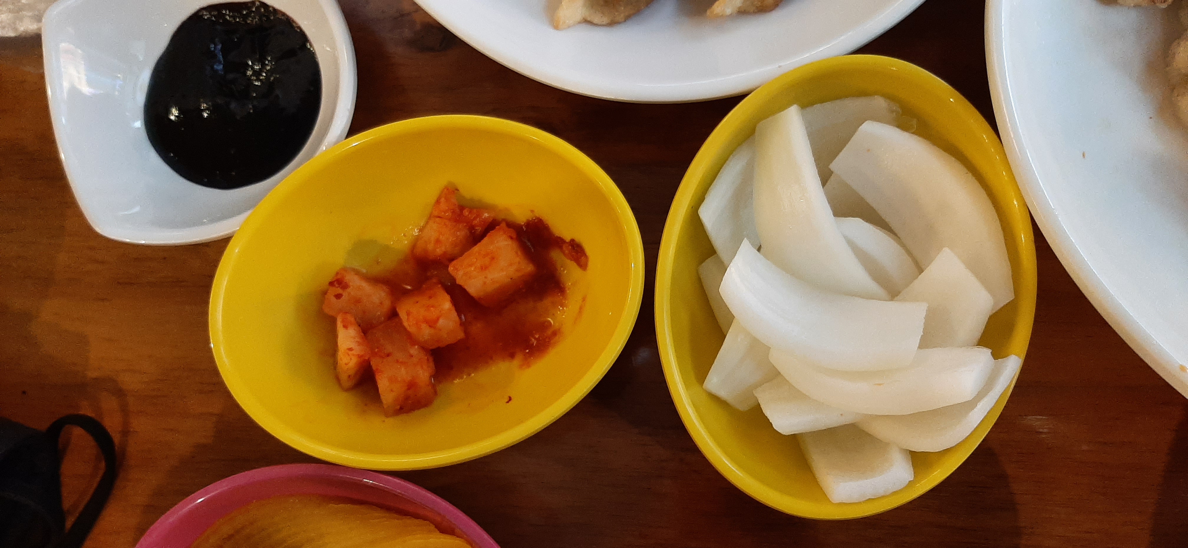 짬뽕 2개, 탕수육 1개, 군만두 4피스, 참이슬 1병을 주문한다. 기본 반찬으로 작게 썰은 깍두기와 얇게 썰은 단무지가 나온다. 나는 중식당에 가면 항상 양파와 춘장을 달라고 하여 먹는다. 왜냐하면 중식당의 기본 반찬은 양파이기 때문이다.