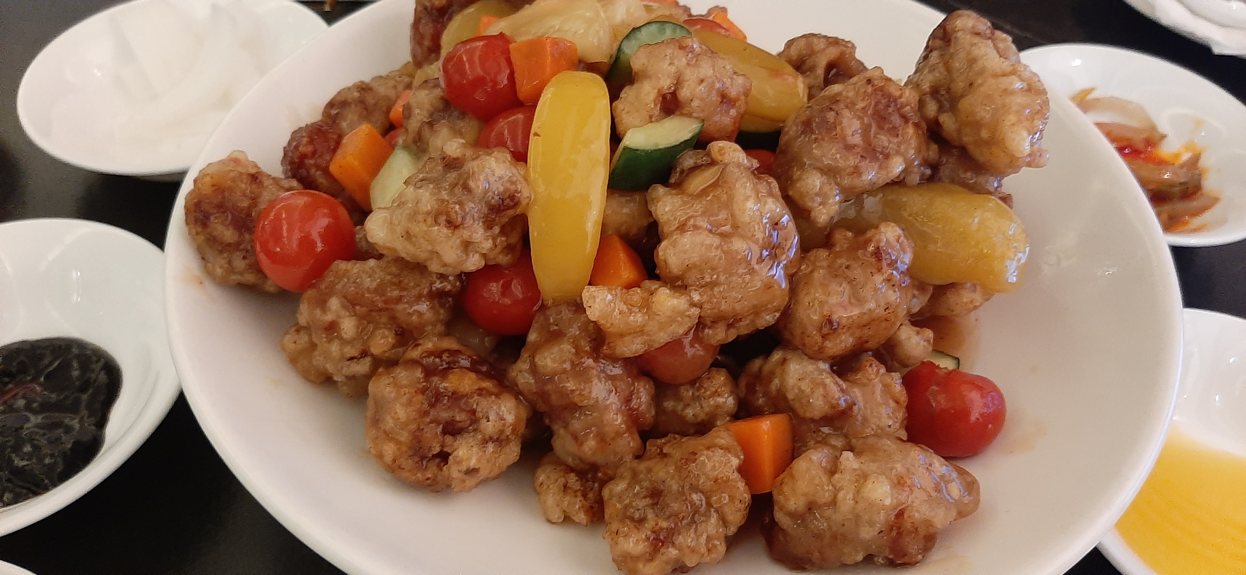 흑돼지탕수육에 방울토마토, 당근, 오이, 통조림 복숭아, 통조림 파인애플이 부먹으로 같이 나와서 좀 신선한 느낌이다.