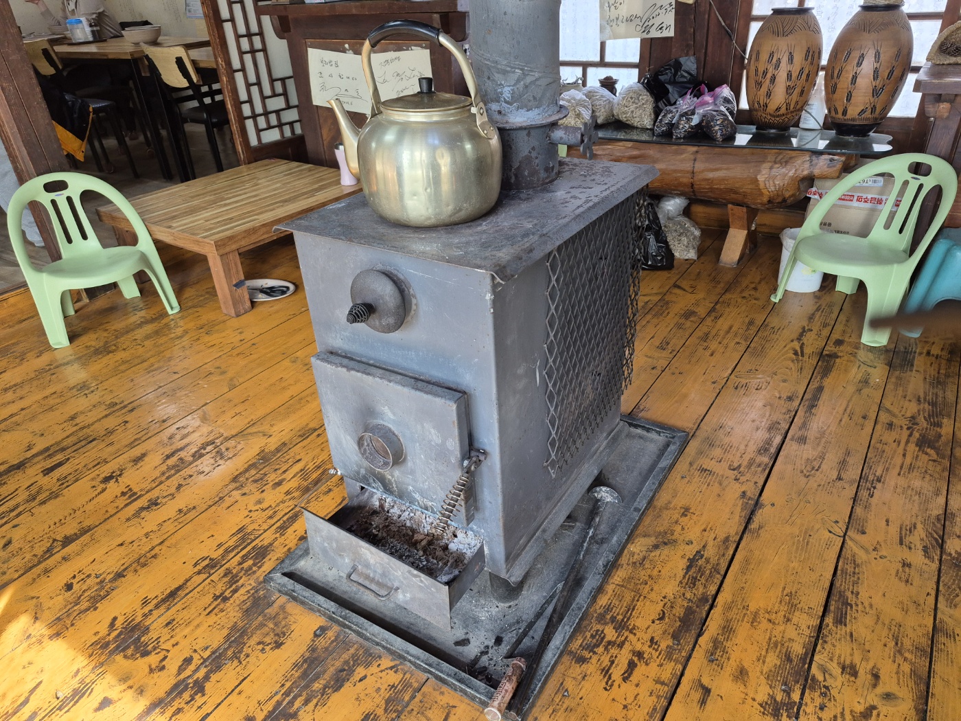 난로 위에 노란 주전자에서 물(무말랭이 차)이 끓고 있다.