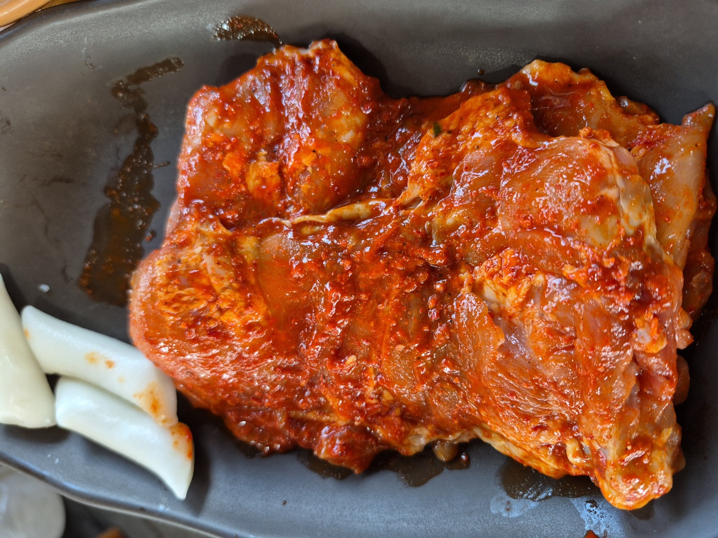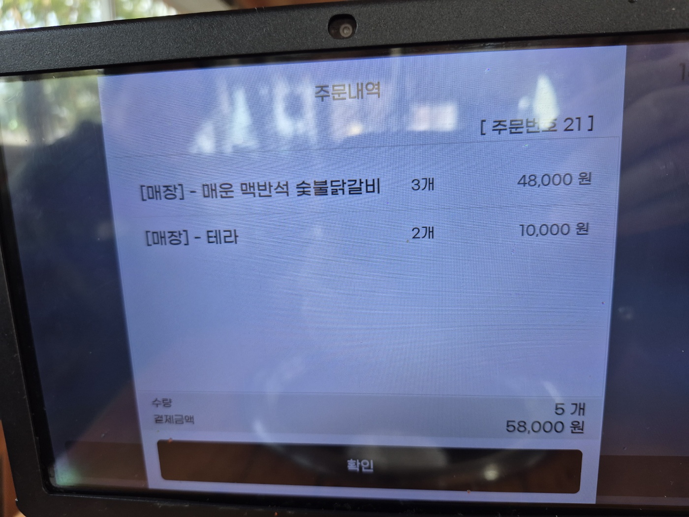 참나무 숯불 닭갈비 막국수에서는 직화구이가 아니고, 참나무 숯불 위에 맥반석을 올려서 다양한 양념의 닭갈비(닭다리살을 펴서 양념한 닭고기) 구워 먹는 방식이다. 닭갈비 3인분과 테라 맥주 2병을 키오스크로 주문한다.