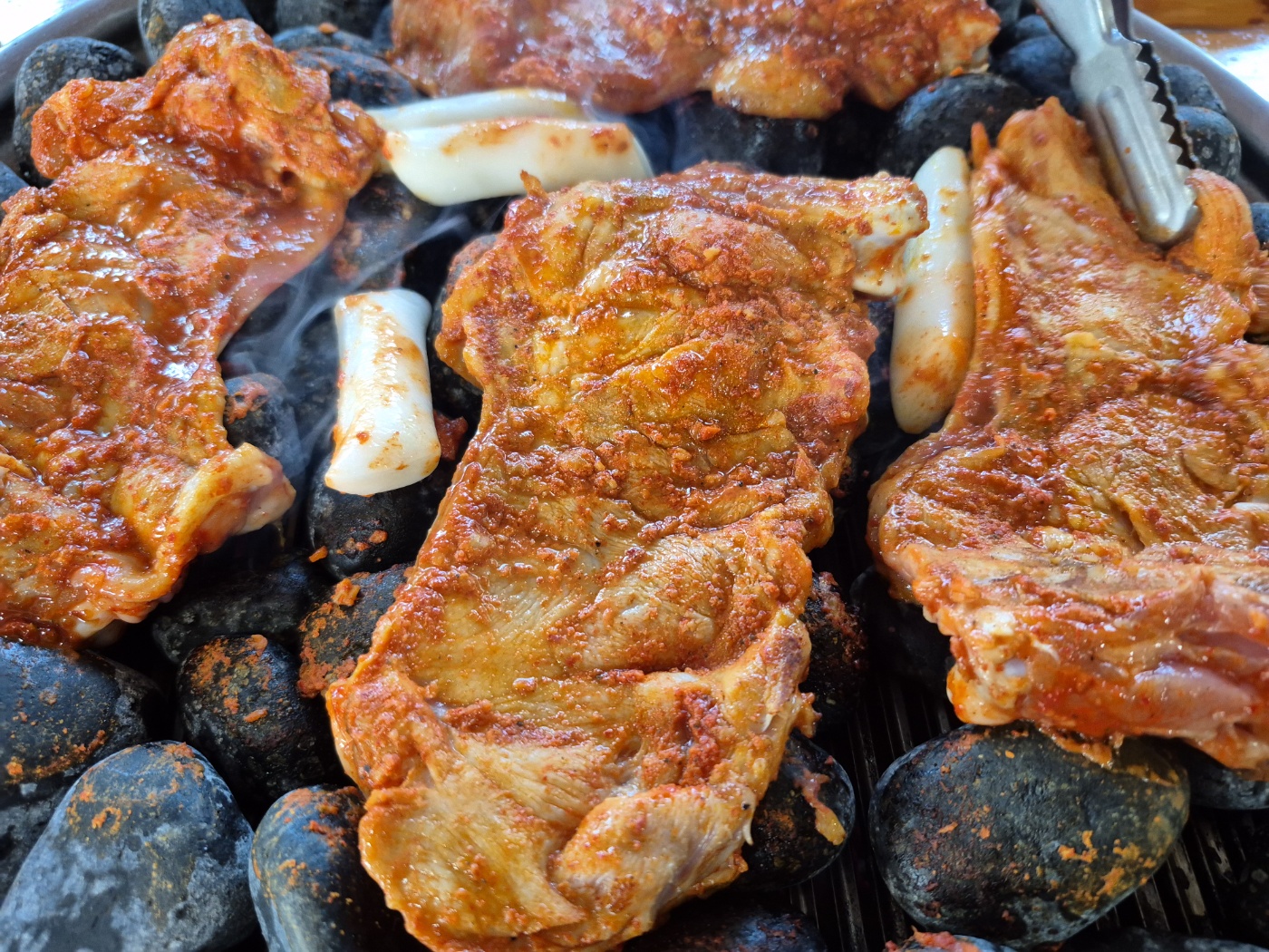 참나무 숯불 닭갈비 막국수에서는 직화구이가 아니고, 참나무 숯불 위에 맥반석을 올려서 다양한 양념의 닭갈비(닭다리살을 펴서 양념한 닭고기) 구워 먹는 방식이다. 닭갈비 3인분과 테라 맥주 2병을 키오스크로 주문한다.