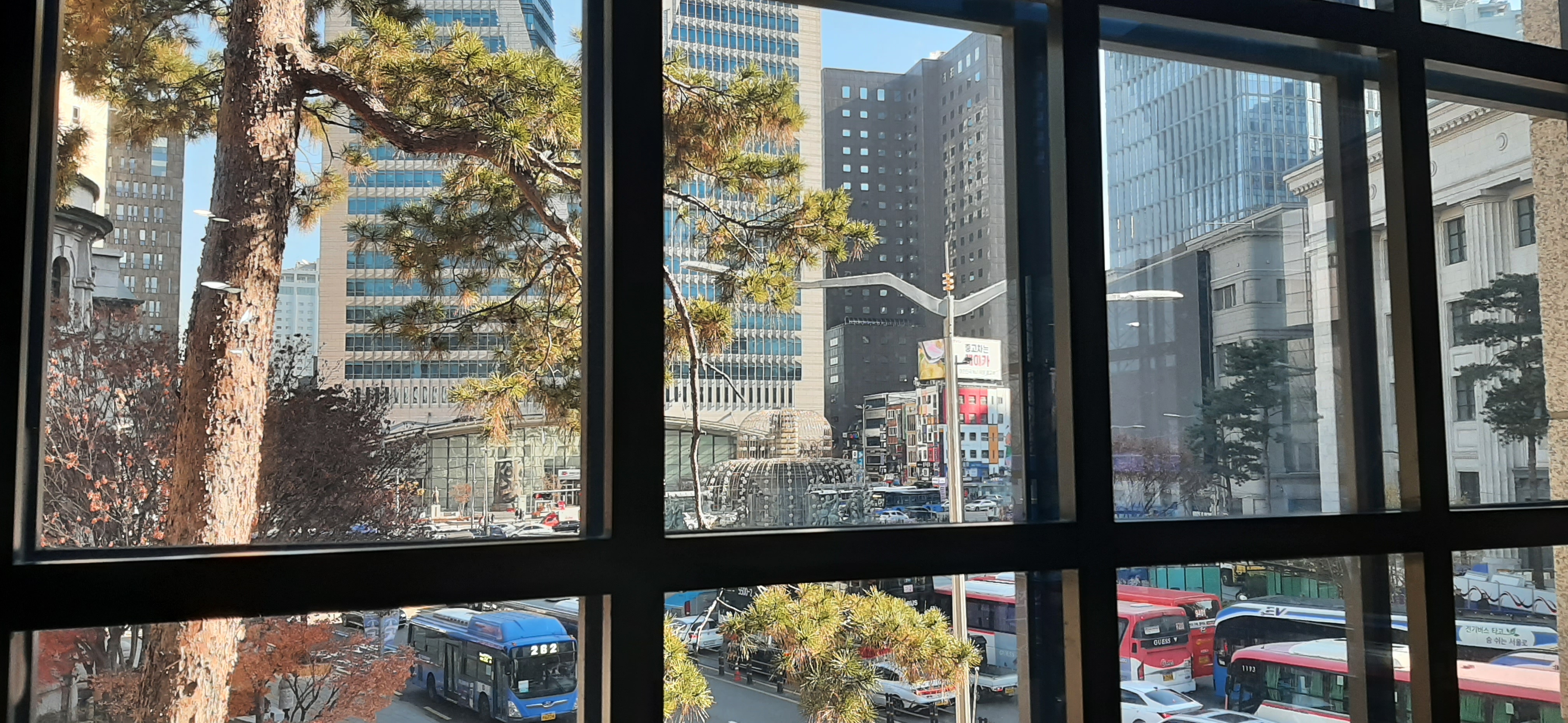내가 앉은 창가 자리에서 한국은행 분수대를 중심으로 신세계백화점 본점, 중앙우체국이 보인다. 사실은 어제저녁에 신세계백화점 본점의 파사드가 이뻐서 구경 오려고 했는데, 같이 오기로 한 지인이 급한 일이 생겨서 못 왔다. 그런데 오늘 낮에 와서 보니 기분이 좋다.