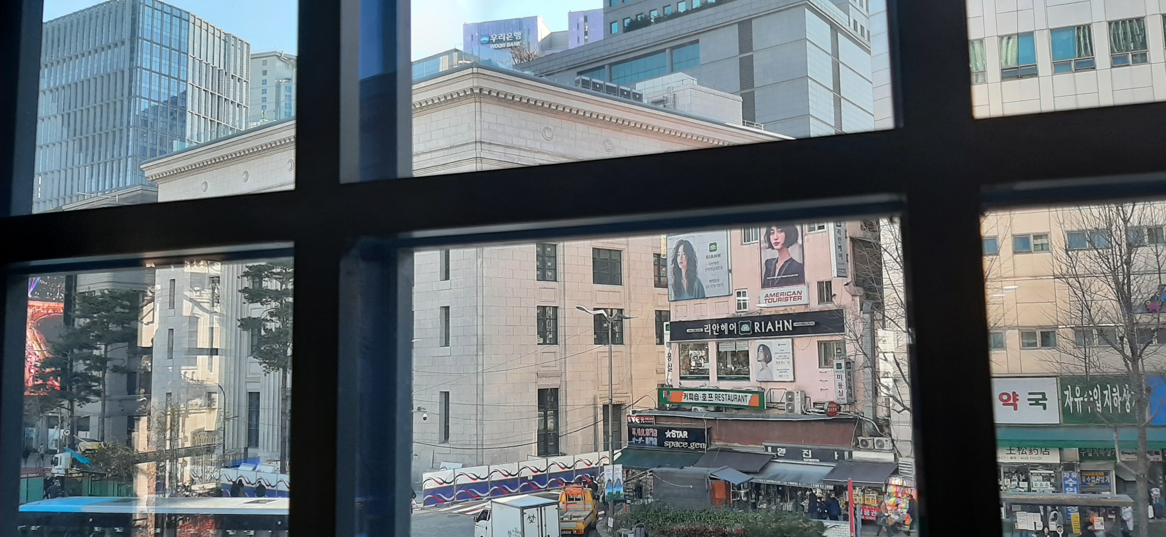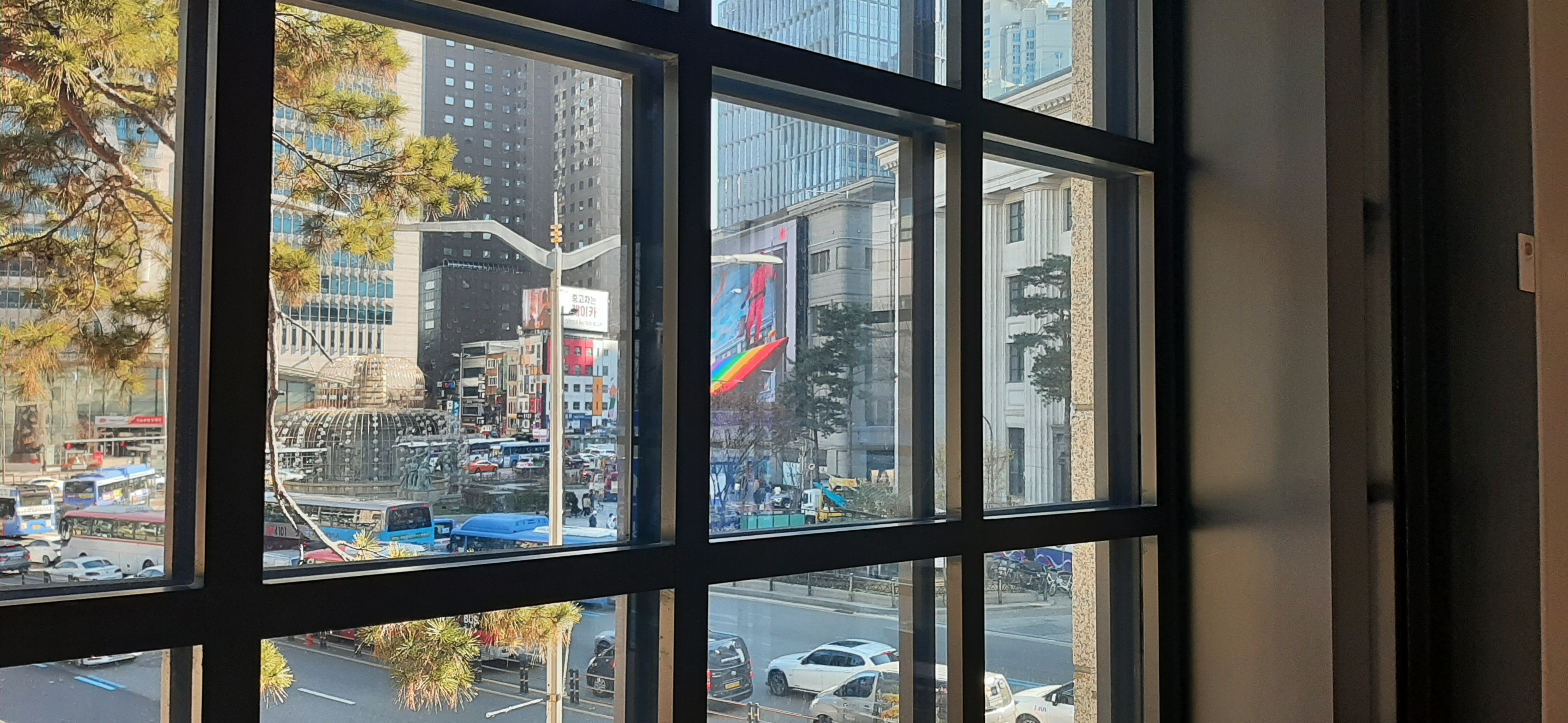 내가 앉은 창가 자리에서 한국은행 분수대를 중심으로 신세계백화점 본점, 중앙우체국이 보인다. 사실은 어제저녁에 신세계백화점 본점의 파사드가 이뻐서 구경 오려고 했는데, 같이 오기로 한 지인이 급한 일이 생겨서 못 왔다. 그런데 오늘 낮에 와서 보니 기분이 좋다.