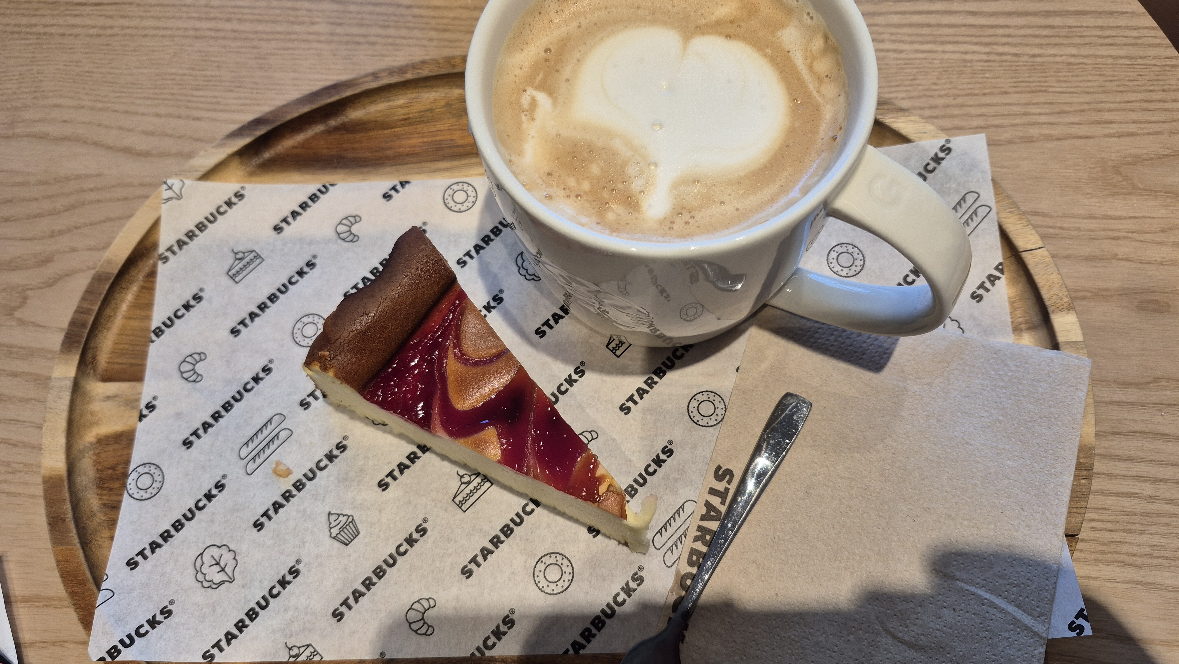 마님께서는 라테와 치즈케이크를 주문하여 맛있게 드신다.