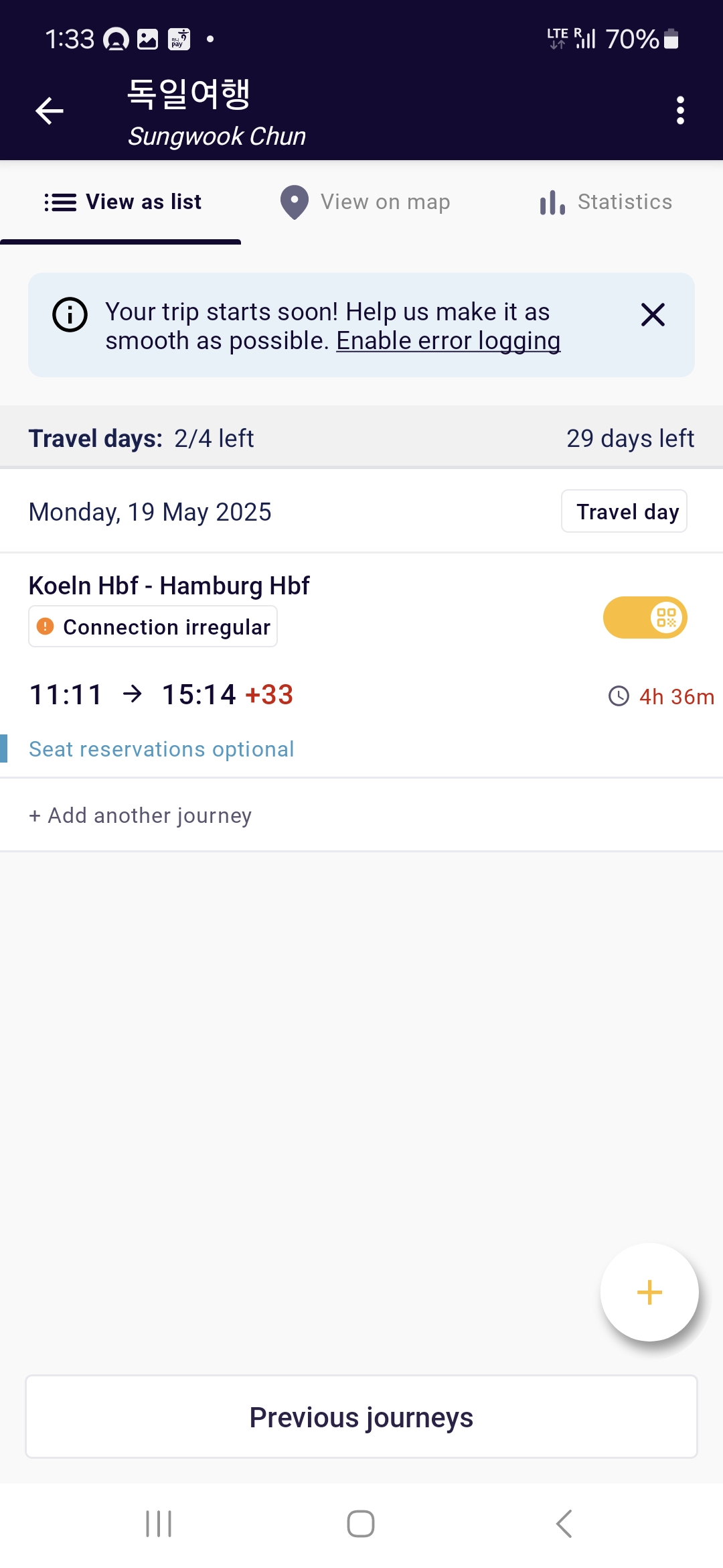 2025년 5월 19일(월요일) 9시 30분에 우리가 묶던 스테이션 퍼 백포커스에서 체크 아웃을 하고 킐른 중앙역으로 간다.