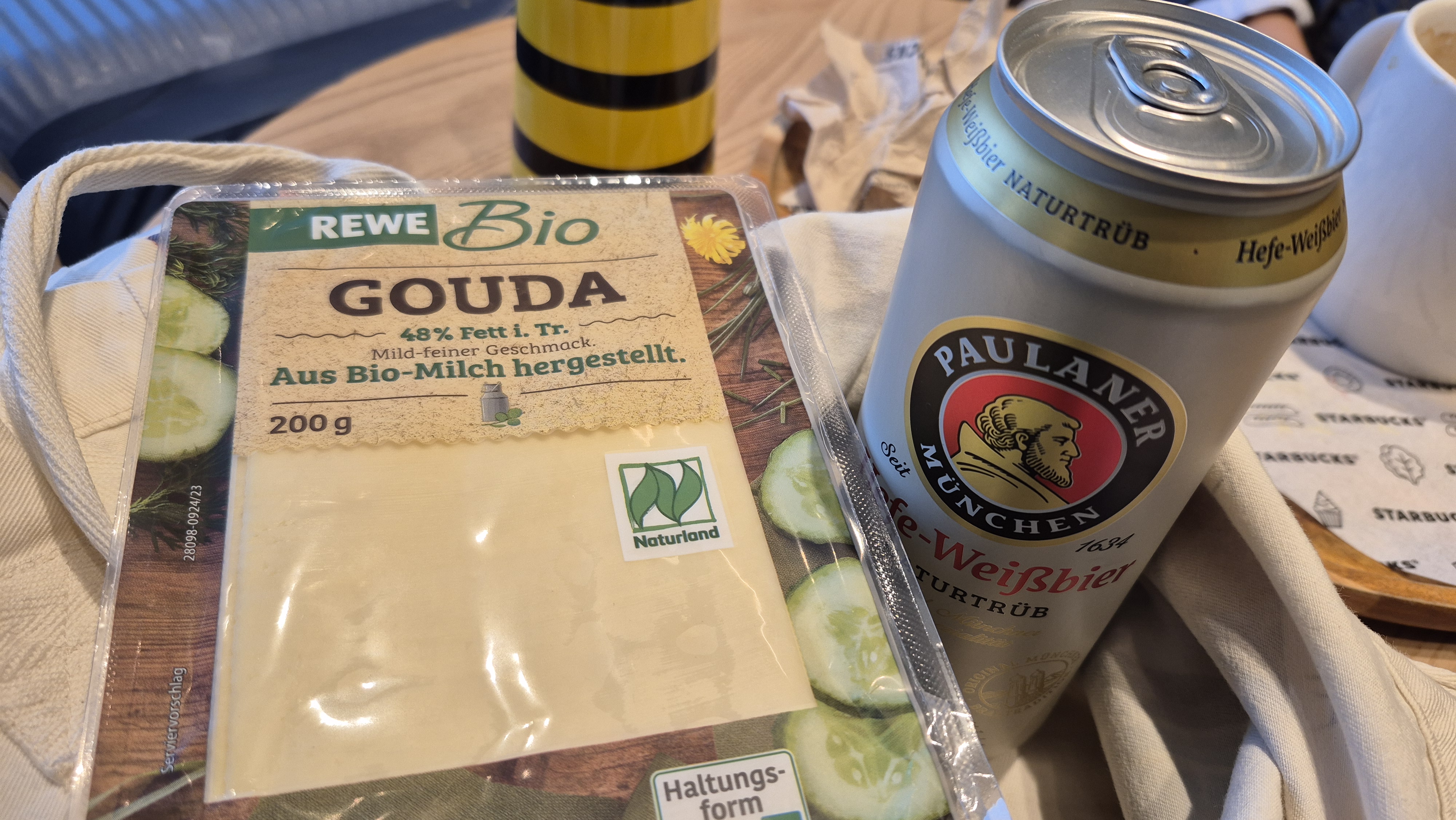 나는 중앙역 rewe에 가서 맥주캔과 생수병 합이 4개를 pfant 해서 1유로를 받고, 파울라너 캔맥주와 치즈를 사서 마님께서 기다리는 스벅으로 간다.