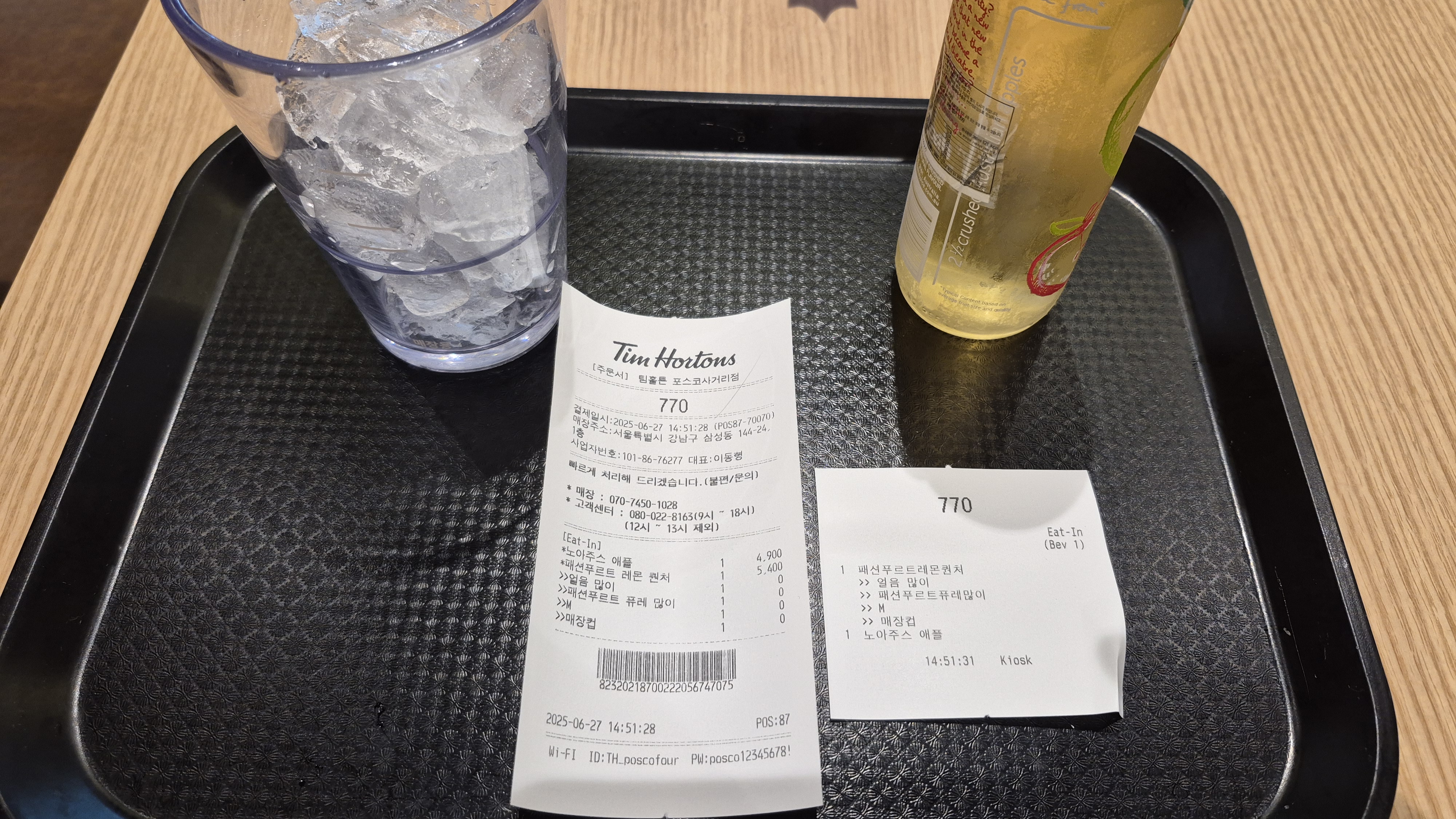 팀홀튼 포스코사거리점에서 노아주스 애플을 마신다.