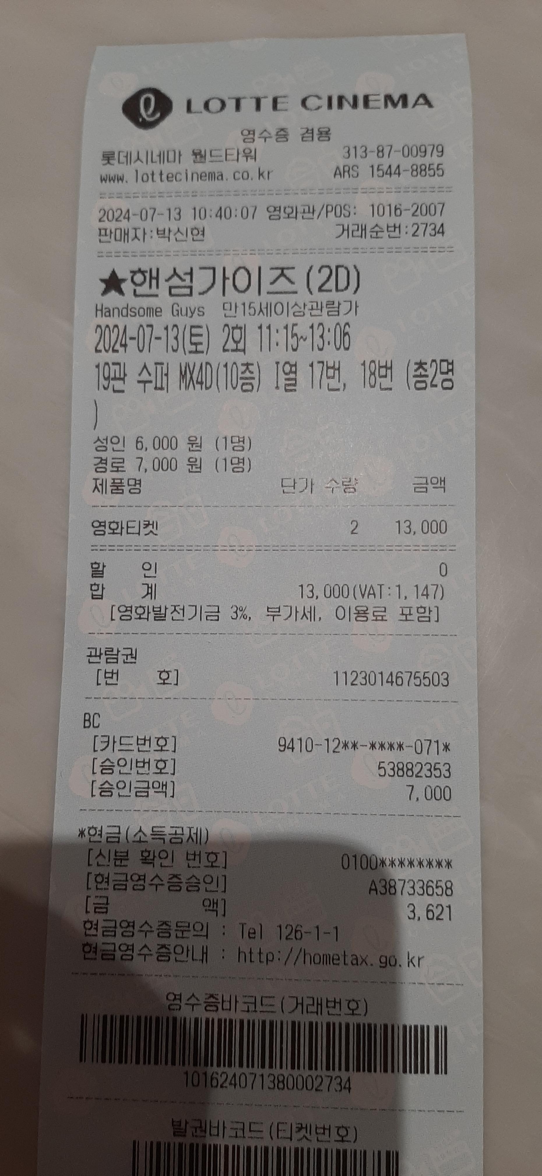 2024년 7월 13일(토요일) 롯데시네마 잠실점에서 오전 11시 15분에 상영하는 코미디 영화 핸썸가이즈를 관람했다.