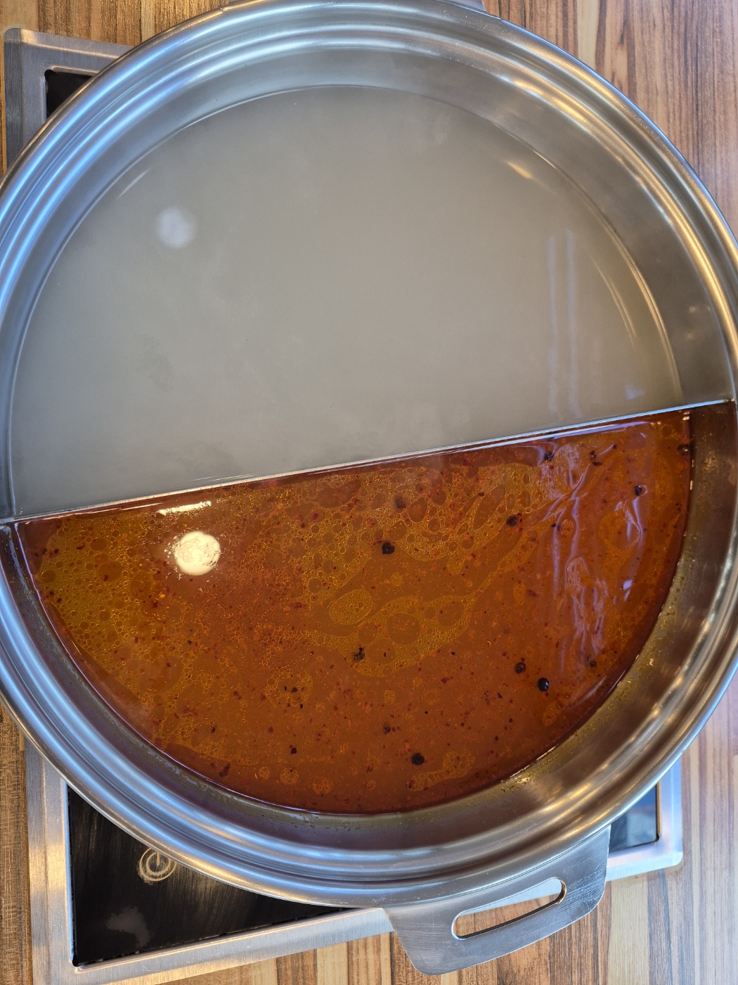 두 종류의 육수를 담은 냄비를 인덕션에 올리고, 각자 먹고 싶은 여러 가지 샤부샤부 재료들을 가져온다.