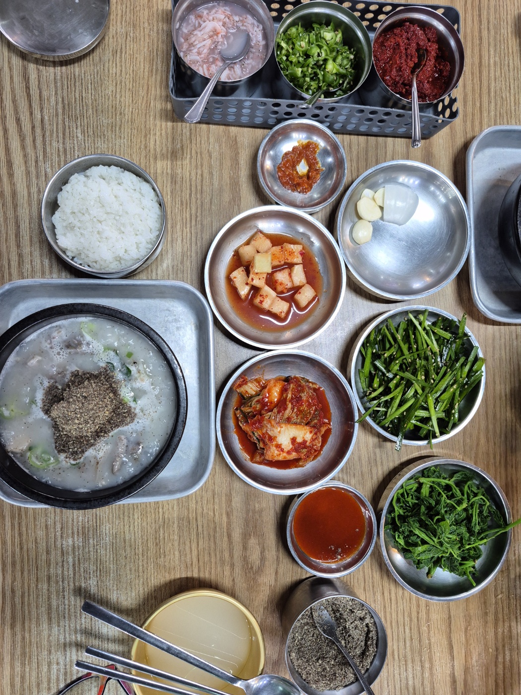 순대국밥 가게에서 부대찌개를 파는 것은 처음 본다. 그래도 지역 주민이 추천한 맛집이라 먹어보기로 결정하고 순대국밥을 먹는다.