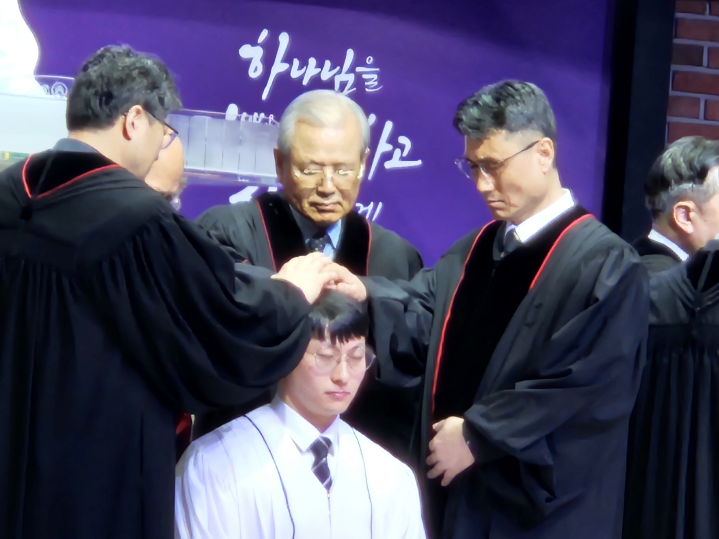일반 성도의 세례식은 목사님 한 분이 안수를 하지만, 목사 안수식은 3-5분의 성령 충만하신 목사님께서 안수를 한다.
