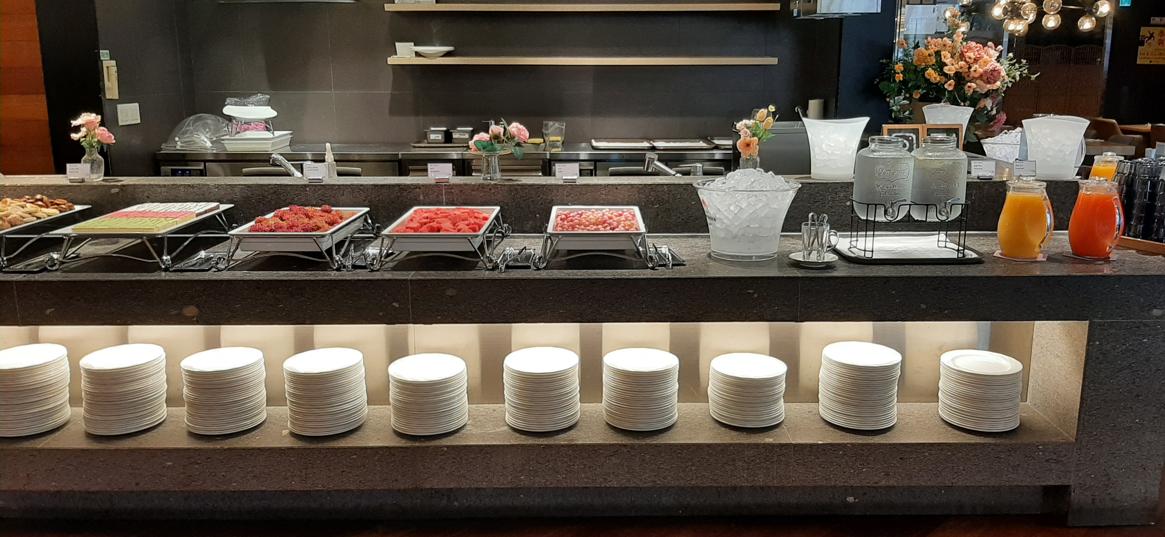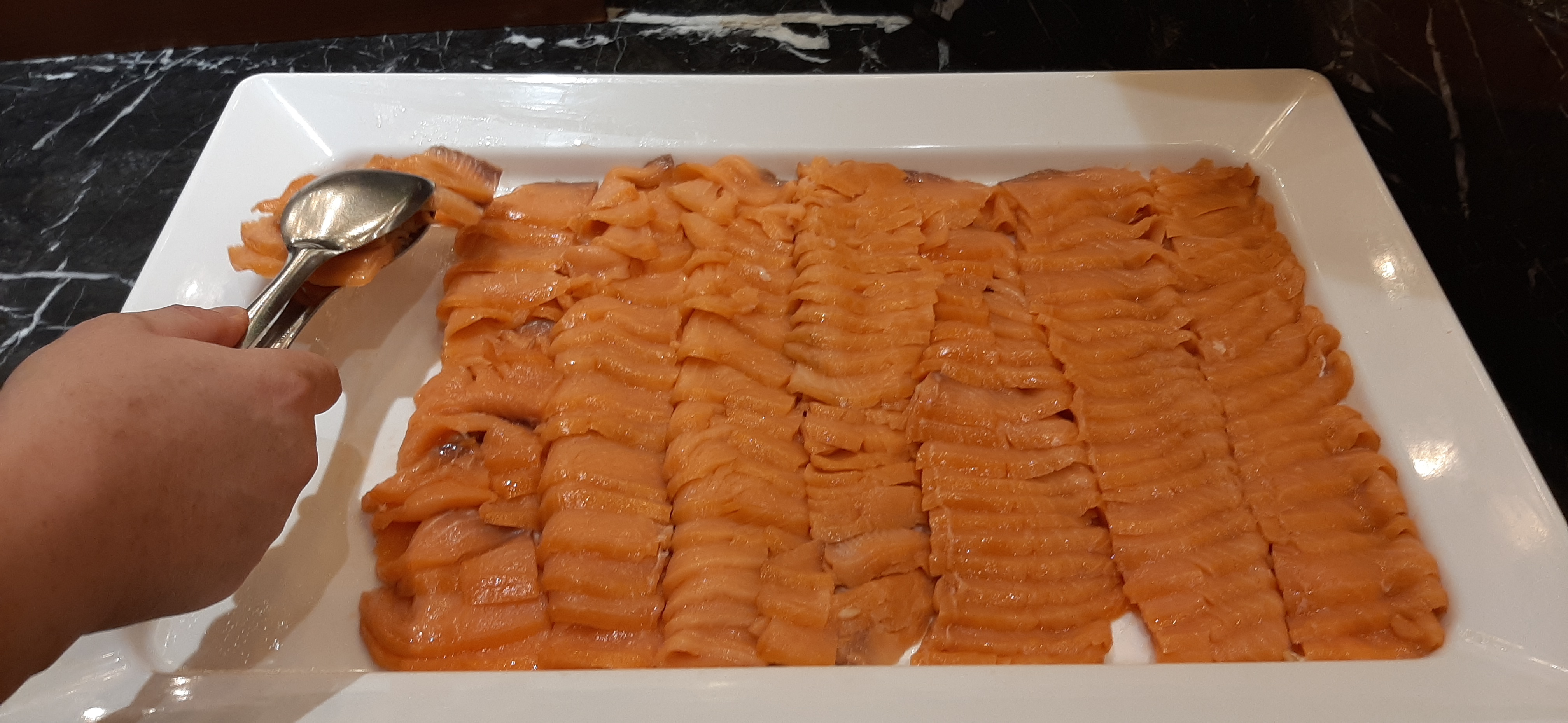 PJ호텔에 도착하여 2층에 있는 컨시어지를 지나서, 3층으로 올라가니, 식당이 보이고, 식당 입구에서 직원들이 예약을 확인하고, 자리로 안내를 한다. 내 자리를 확인하고, 음식을 쭉 둘러보니, 가격대비 꽤 괜찮아 보인다. 우선 내가 좋아하는 연어를 듬뿍 담고, 샐러드, 수박, 포도를 담아서 자리로 왔다. 수박과 포도도 신선하고 맛있다.