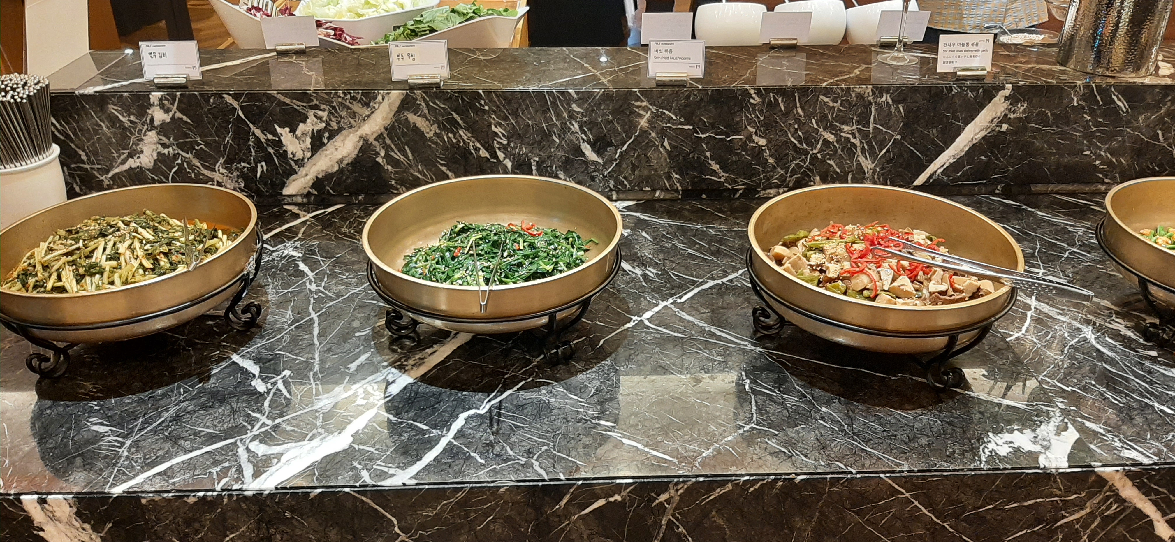 뷔페에서는 맛을 보지 않고, 듬뿍 담아 오면, 맛없는 음식을 꾸역꾸역 먹어야 하므로, 처음에는 한두 개만 담아서 가져와야 맛없는 것을 억지로 먹는 고문을 면한다. 내가 많이 좋아하는 연어, 샐러드, 과일 그리고 열무김치가 완전 대박이었다. 약간 쉰듯한 맛인데 먹어보니 정말 맛있어서 많이 먹었다. 국물에 잔치국수를 말아서 먹으면 더 맛있겠다는 생각을 했다.